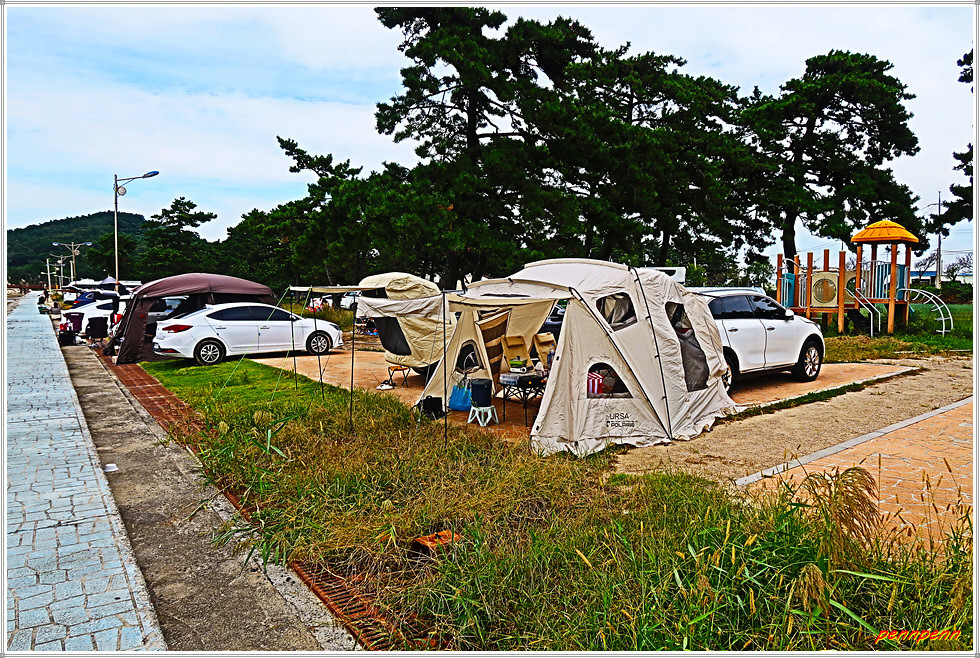 곧이어 해변 우측 마을길로 들어가 좌회전해 두우리 상정마을의 칠산정을 지나면 길은 도로 좌측의 나무데크로 이어집니다. 데크 전망대에서 내리막길을 가다가 77번 국도를 벗어나 바닷가로 내려서면 바로 백바위 해수욕장입니다. 영광군 염산면 두우리 소재 백바위해수욕장은 자연경관이 아름답고 주변 환경이 캠핑하기에 적합한 조건을 갖추고 있으며, 백사장 입구에 울창한 노송 숲이 있어 캠핑을 하는 데 주요한 몫을 담당합니다. 또한 산책하기도 매우 좋은 환경을 가지고 있어 가족단위의 캠퍼들이 즐겨 찾습니다. 이곳은 찾은 사람들이 아이들과 함께 바닷가에서 즐거운 한 때를 보내고 있더군요.