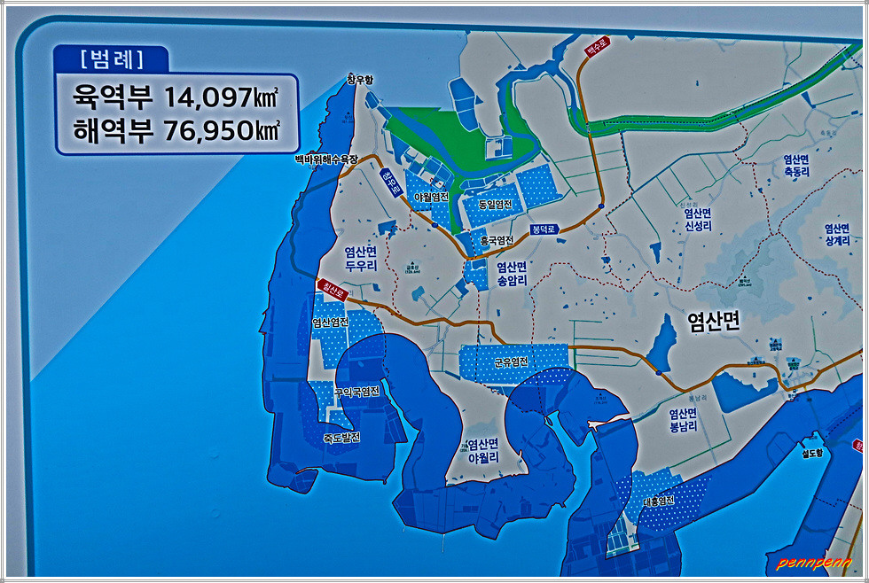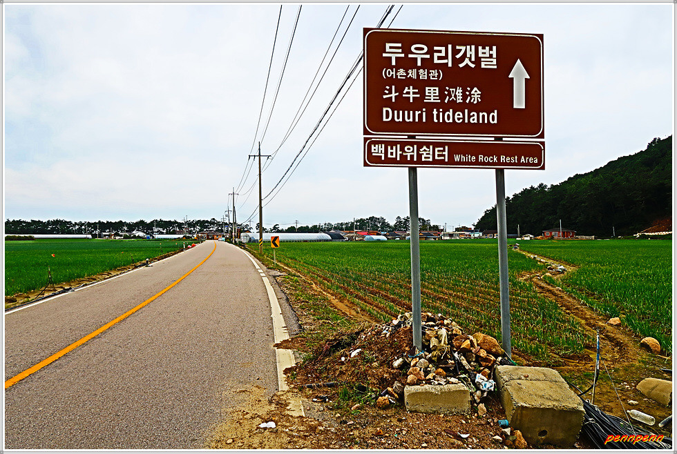 야월교회를 뒤로하고 77번 국도를 따라 서쪽으로 갑니다. 야월1구 야장마을, 야월새정미소, 야월3구 운곡마을, 염산염전 버스정류장, 천일염장기저장시설, 두우리1구 당두마을, 두우리1구 마을회관, 파밭과 대추나무를 차례로 지나면 바닷가입니다. 이곳은 아까 갈림길에서 방조제길을 이용해 월평항을 경유한 후 가음산 남쪽을 한 바퀴 돌아오는 정식 37코스와 합류지점입니다. 여기서 북쪽 두우리해수욕장까지의 거리는 1.07km로군요.