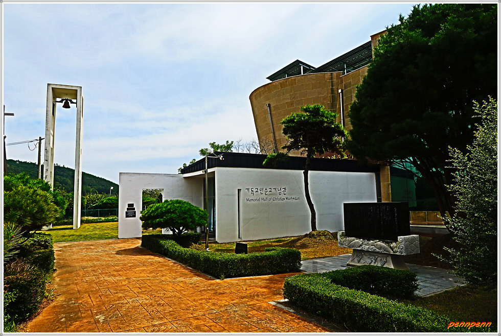 교회 앞에는 순교기념탑과 안내문이 있고 좌측으로 돌아가면 교육관 뒤편에 기독교인순교기념관이 있습니다. 기념관 앞 야외에는 교회종탑과 십자가 등 상징조형물이 설치되어 있네요. 기념관은 65인 순교자의 자료와 순교의 정신을 담아 한국교회와 세계성도들에게 순교신앙을 나누기위해 세운 것으로 각종 자료들이 전시된 곳입니다.