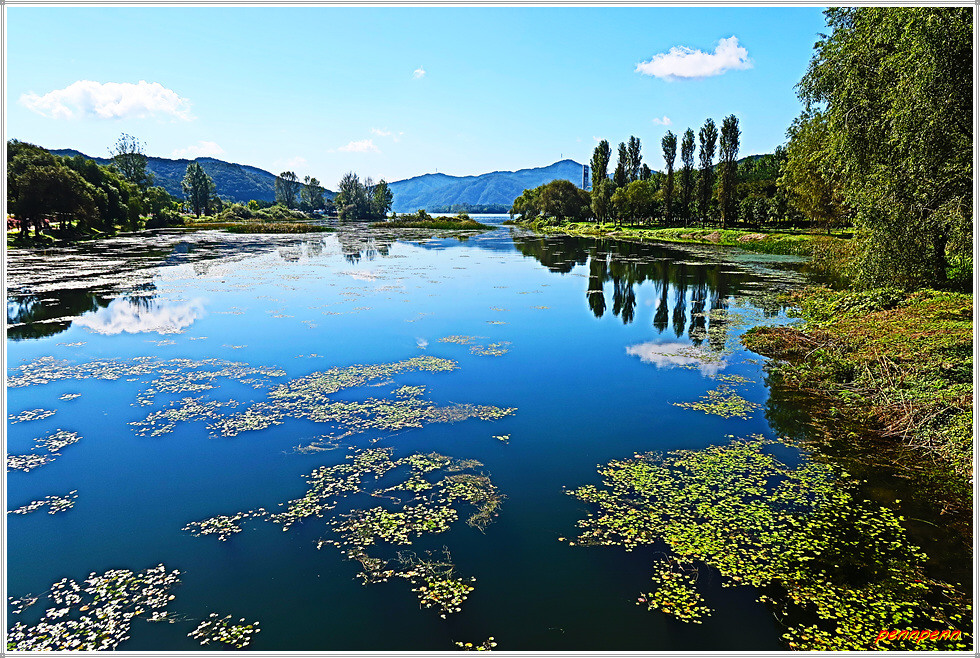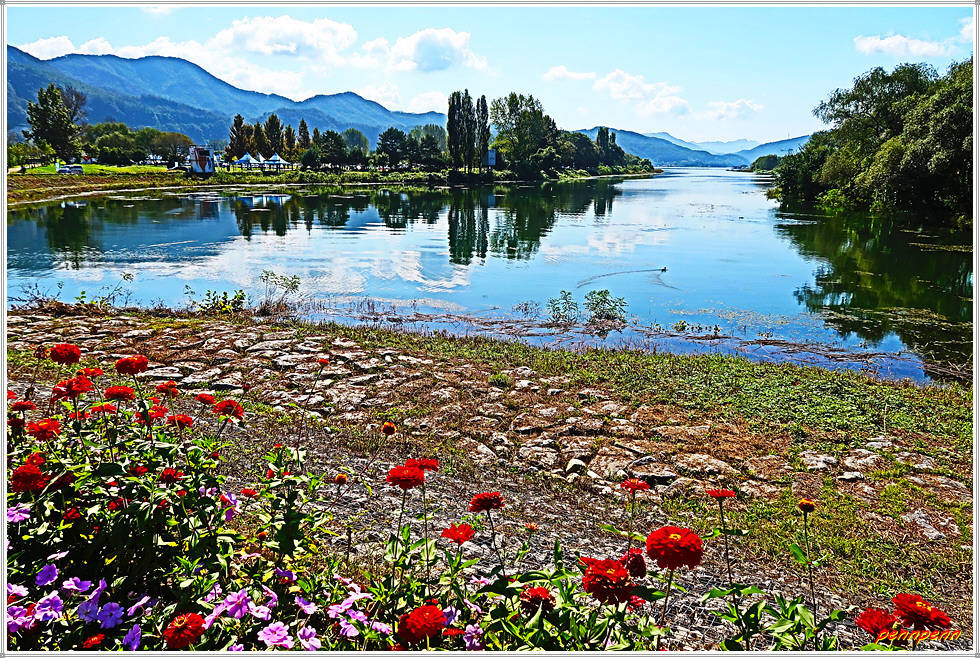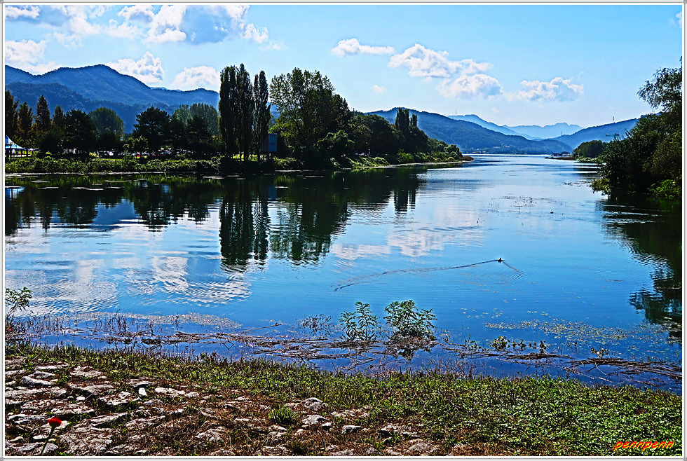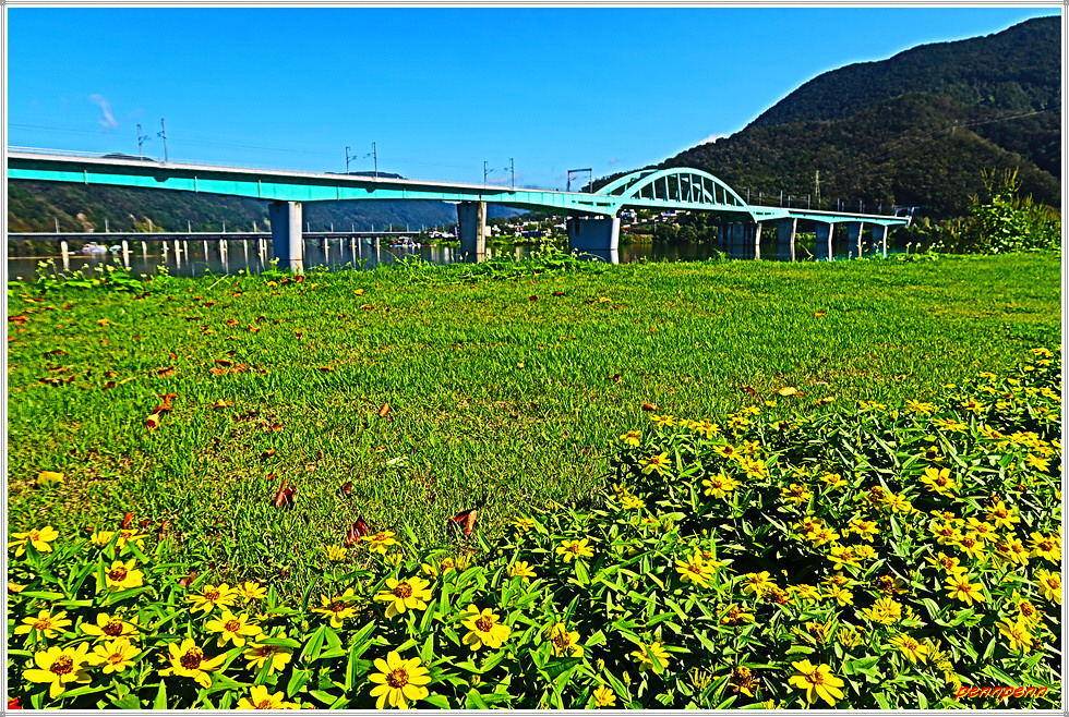 서도에서 중도로 이어지는 도로변에는 자라섬 꽃페스타(23. 9. 16-10. 15)를 알리는 안내문이 있는 가운데 중도로 가는 도로의 진입로에는 화려한 꽃이 피어 있고 좌측에는 경춘선 철교가 북한강을 가로지르고 있으며, 우측 북한강변에는 잔잔한 물결에 비친 수목의 반영(反影)이 한 폭의 그림처럼 아름답습니다.