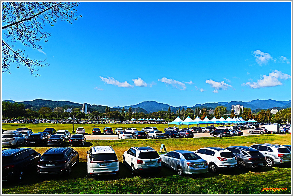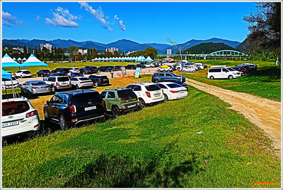 자라섬 중도에는 지름 100m가 넘는 거대한 원형 잔디광장을 갖춘 생태문화공원으로 잔디광장 주위는 주차장으로 활용되고 있습니다. 중도 잔디광장 주변은 추석연휴(9. 28-10. 3)를 맞이해 이곳을 찾은 사람들이 타고 온 자동차가 물결을 이루고 있더군요.