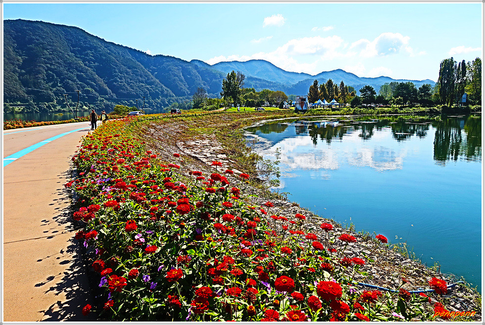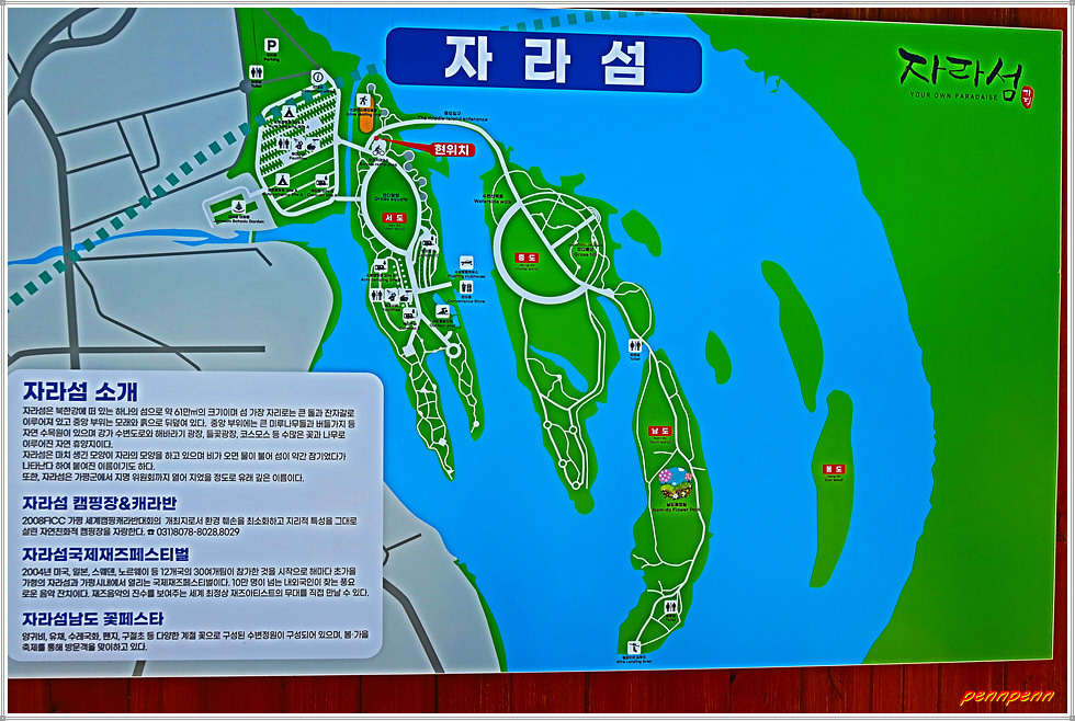 남도로 들어서면 환상적인 가을꽃들이 방문객을 화사한 미소로 맞아줍니다. 현재 이곳에는 핑크뮬리, 백일홍, 미니백일홍, 버베나, 산파첸스, 구절초, 천일홍, 국화, 코스모스, 하늘바라기 등이 어우러져 북한강변을 꽃으로 수놓은 모습입니다. 또 호주군의 6.25참전을 기리는 “우정의 호주정원”과 포토존이 있어 방문객을 즐겁게 합니다. 남도 선착장에서 지명도가 높은 춘천 남이섬은 남쪽으로 800m 지점에 위치하고 있습니다.(2023. 10. 1)