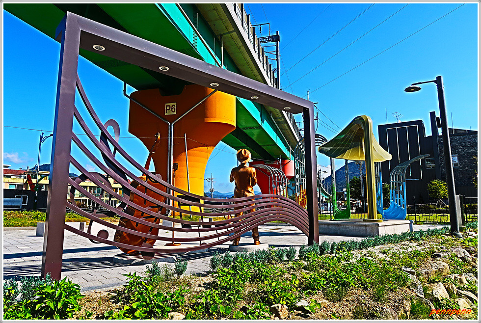 경춘선 가평역 정문으로 나오면 도로변에 자라섬 가는 이정표가 붙어 있기에 이를 따르면 초행이라도 찾아가는 데 어려움은 없습니다. 가평역에서 사거리로 가는 길목에는 가을의 전령이 코스모스가 피어 있어 발걸음이 가볍습니다. 가평역 사거리(경춘선 철도 교량 밑)에서 좌측으로 가면 오목교인데 횡단보도를 지나 오목교를 건너면 재즈페스티벌을 상징하는 트럼펫 연주자와 기타(Guitar) 조형물이 풍경액자 앞에 세워져 있습니다.