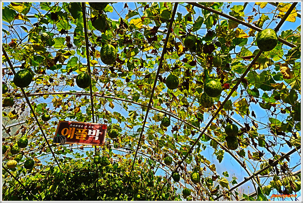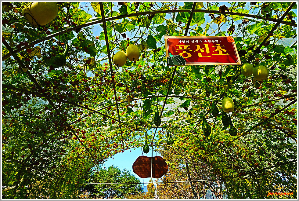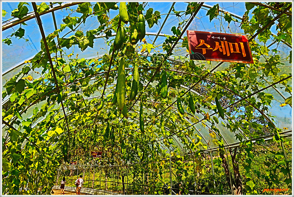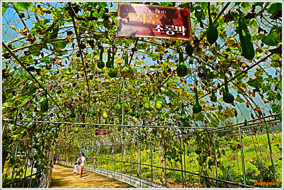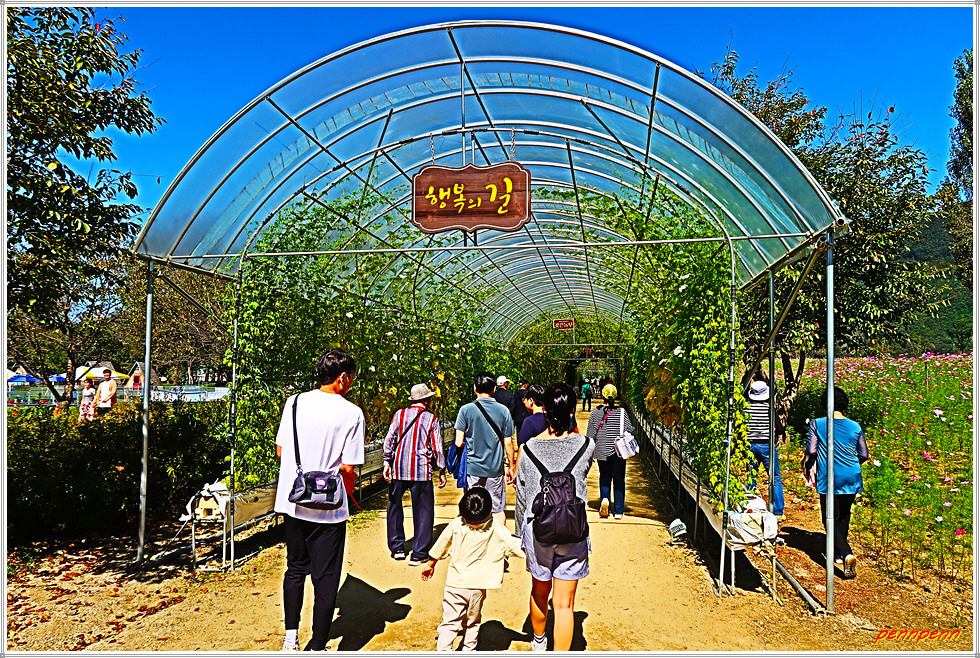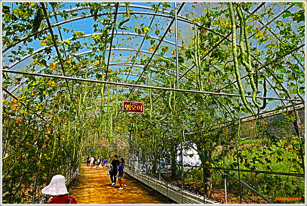 남도의 꽃정원 답사 후 출구 쪽 길목에는 “행복의 길”이라는 이름이 붙은 터널이 있는데 길이 176m, 폭 3.5m로 조성된 터널에는 애플박, 수세미, 조롱박, 여주, 뱀오이, 풍선초 등 다양한 박과류를 재배합니다.