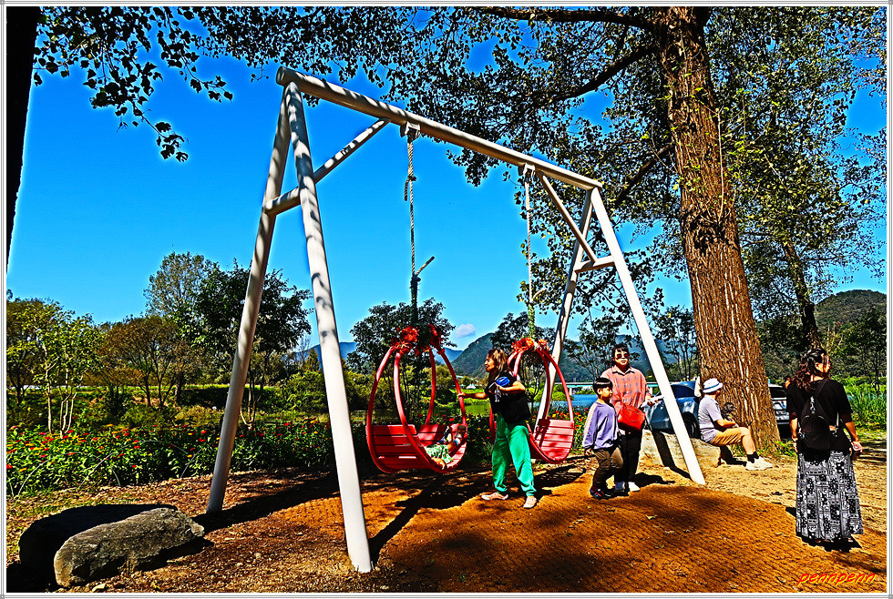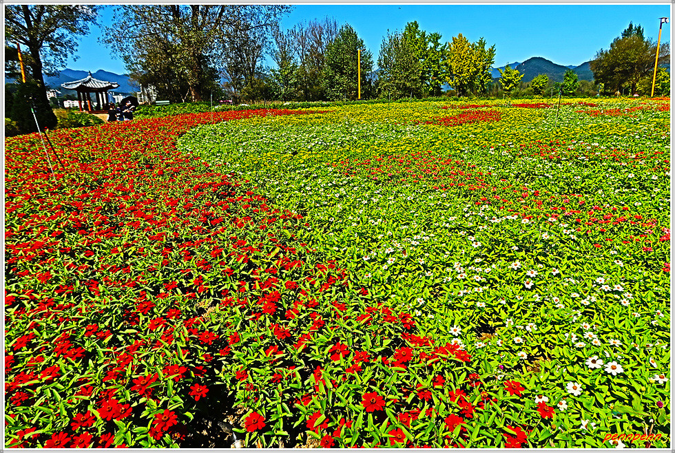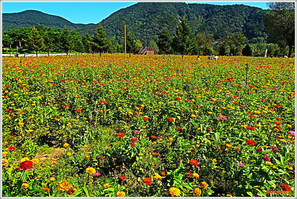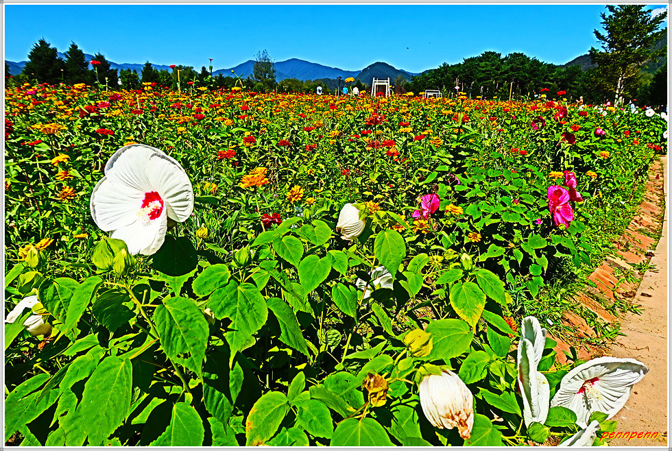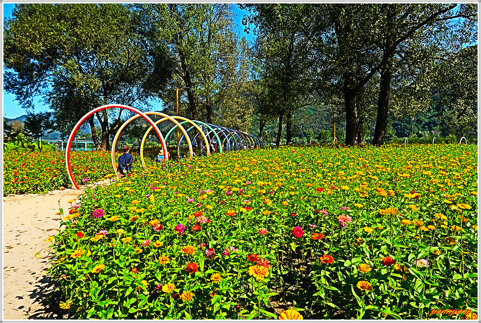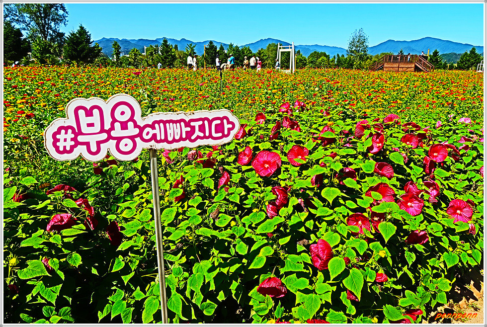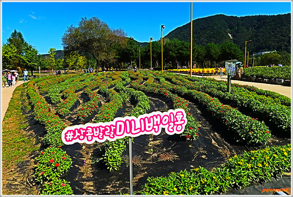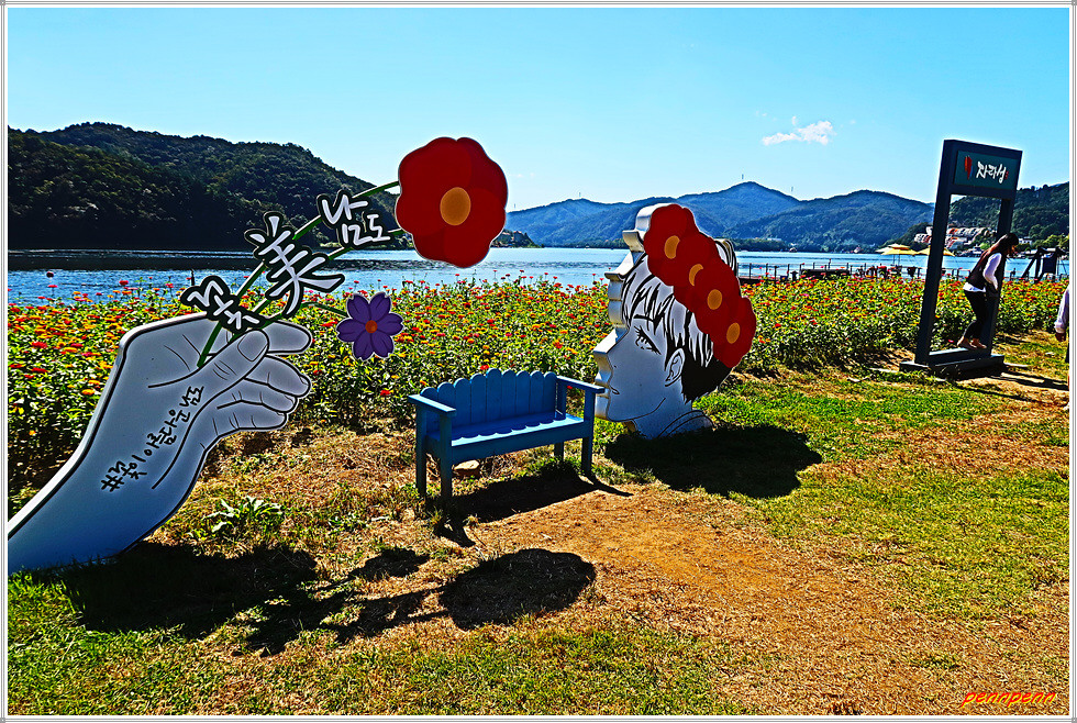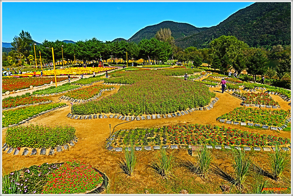 무지개정원 전망대에 오르면 “꽃피는 한반도”를 볼 수 있습니다. 이는 “코로나19로 흩어져 있는 마음의 조각을 태극문양의 기운으로 한데 모아 새 생명의 희망을 불어넣는 한반도를 꽃으로 표현”한 것이랍니다. 365평의 면적에 가평군행정구역(1읍 5면)을 나타내는 6종의 꽃 64,000송이(가평군 인구)를 식재했답니다.