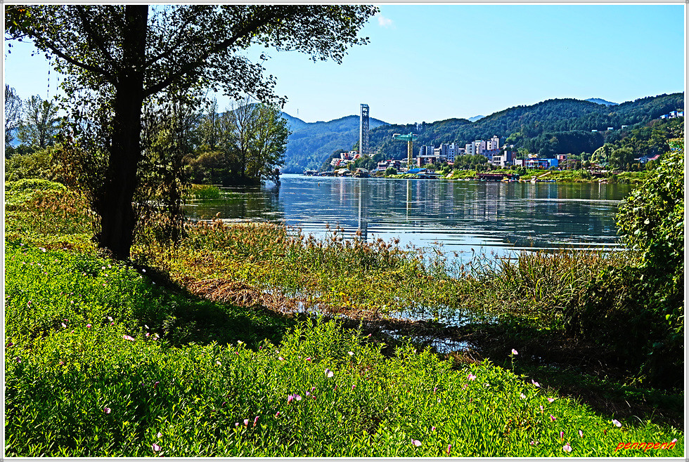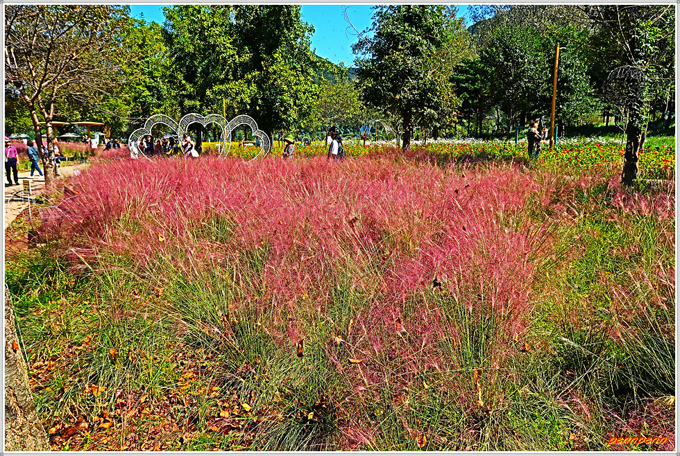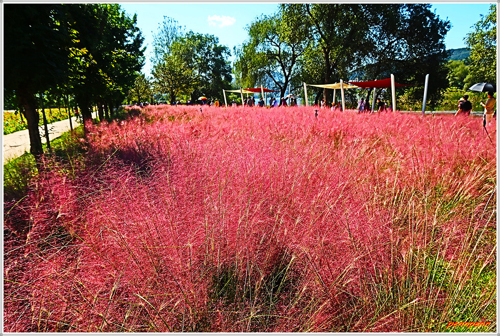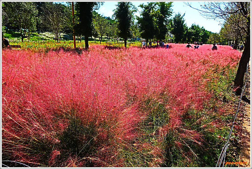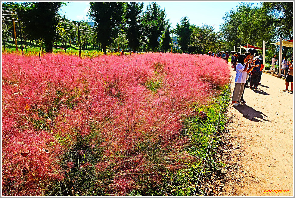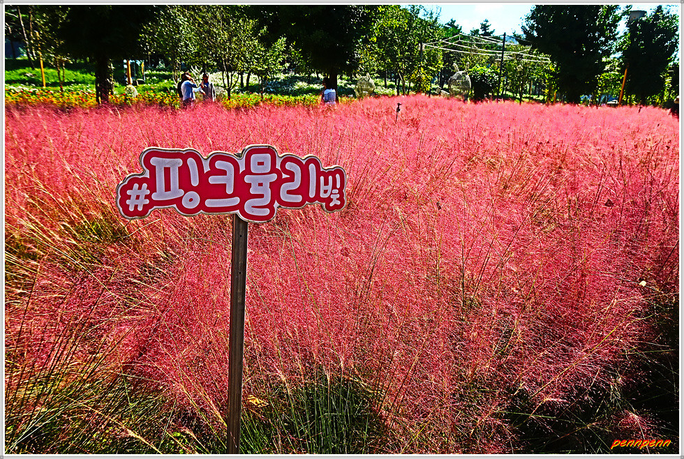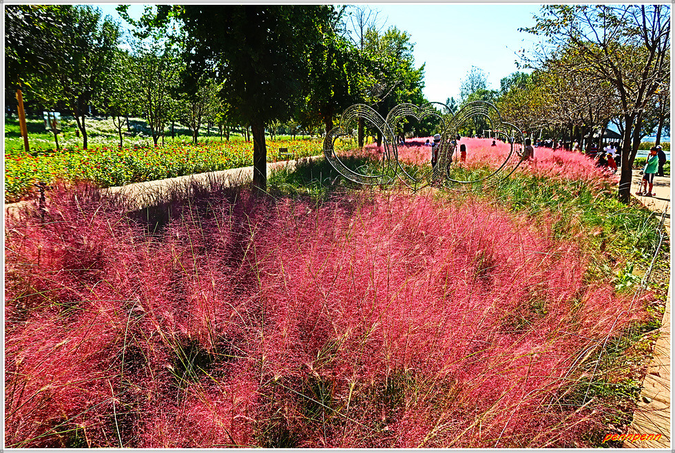 만남의 광장 남쪽 북한강변에는 핑크뮬리 군락지인데요. 미국 동남부가 원산지인 핑크뮬리는 벼과에 속하는 여러해살이풀로서 키는 40-80cm이며, 여름에 자라기 시작해 가을(9-11월)에 분홍색이나 자주색 꽃이 풍성하게 핍니다. 같은 벼과 식물인 억새와 닮아서 분홍억새 또는 털쥐꼬리새라고도 합니다. 가을철 바람에 흩날리는 분홍색 꽃은 매우 매혹적입니다.