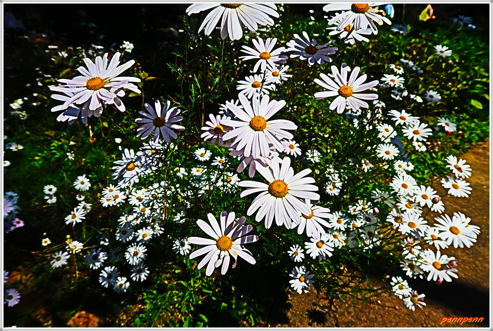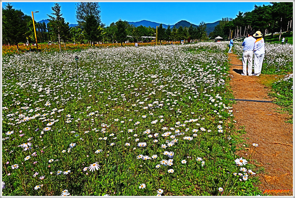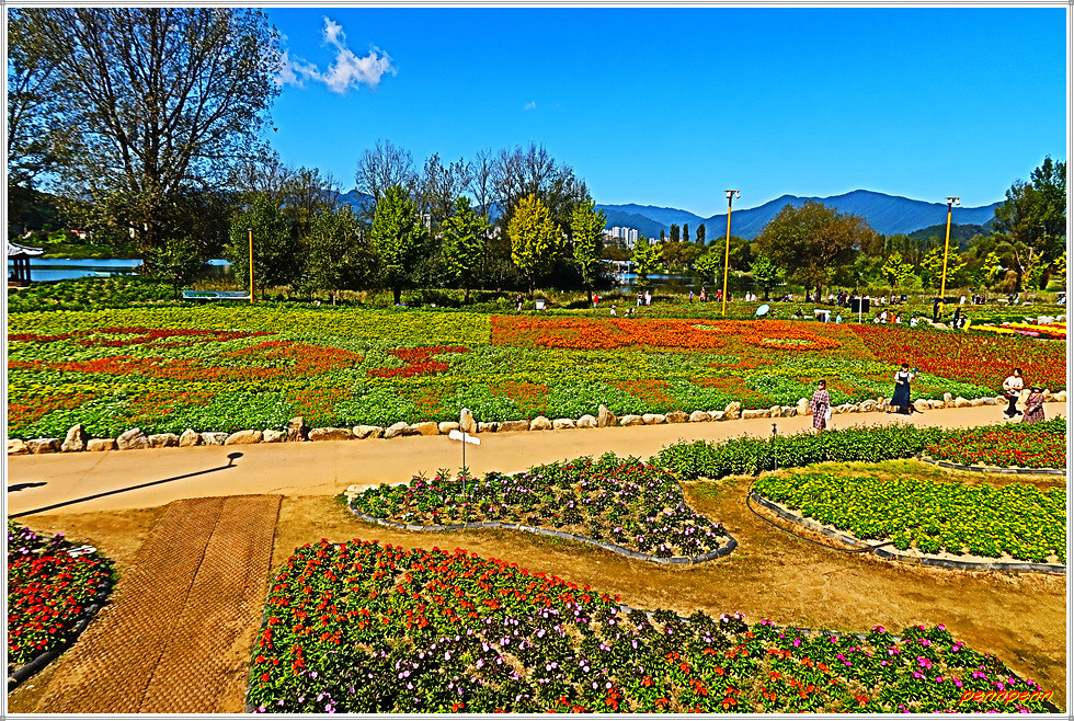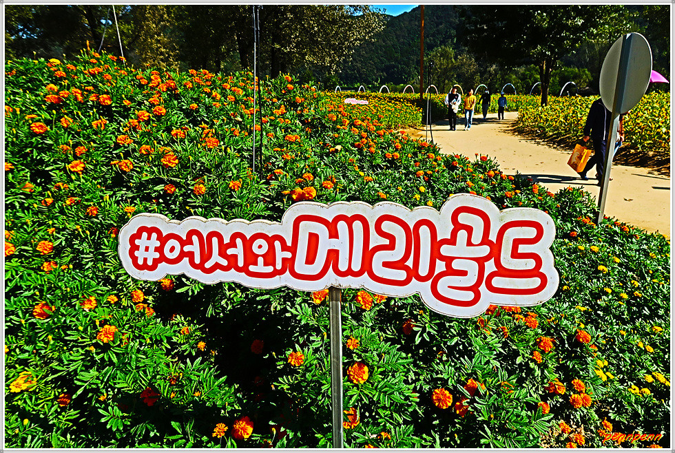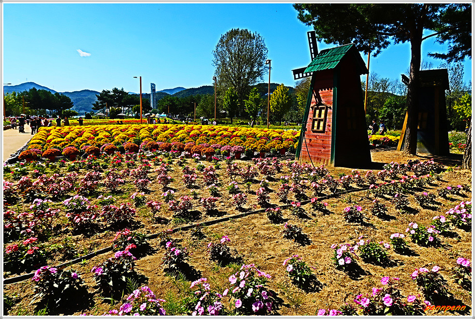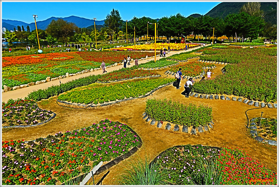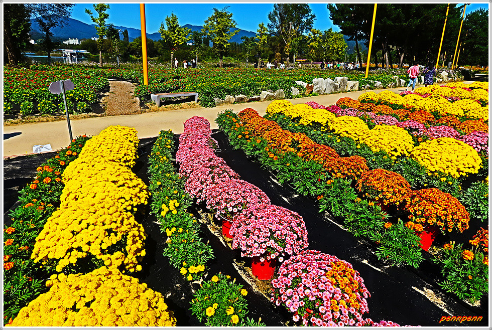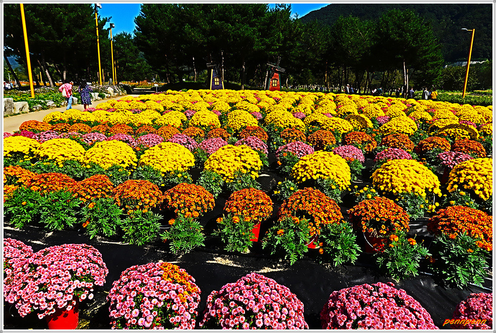남도 꽃정원 중 가장 화려한 곳은 국화단지이며, 미니백일홍도 자주 보입니다. 보라색 꽃을 피우는 버베나, 미니해바라기, 하늘바라기, 메리골드, 팜파스그라스도 보입니다. 남도의 최남단에는 선착장이 있고 그 옆에는 포토존이 있으며, 남도광장에는 가수 “수와 진”이 자선기금 모으기 공연을 하고 있는 모습입니다.