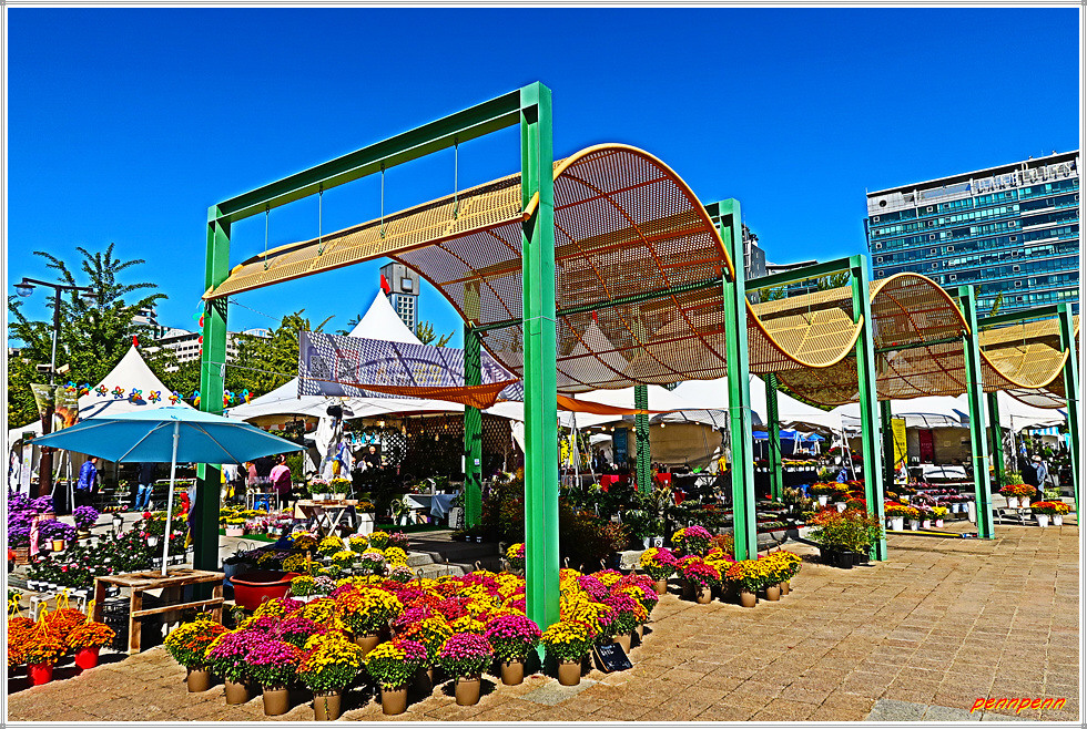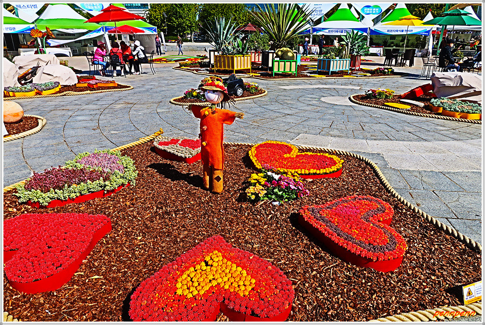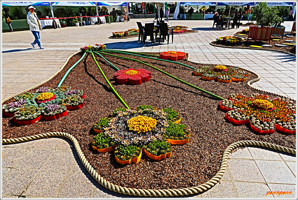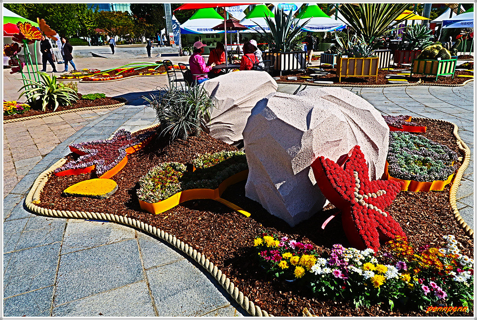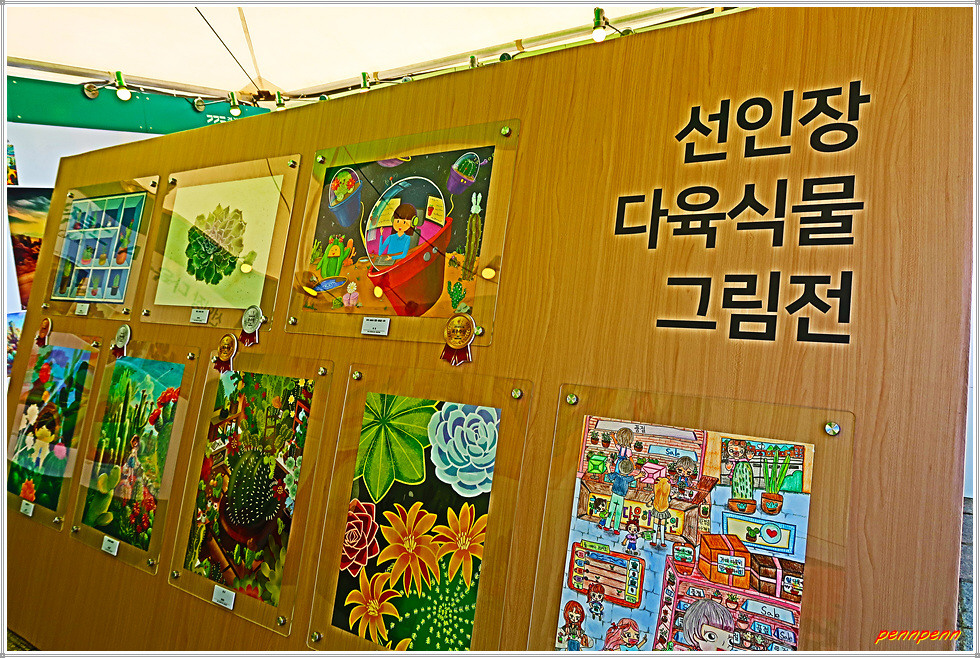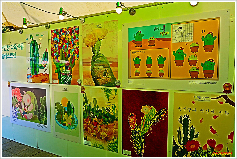 일산호수공원 주제광장에서는 선인장과 다육식물을 그림으로 표현한 그림전이 열리고 있는데, 그림의 색채가 매우 화려하네요. 그리고 늘어선 상점에서 다양한 선인장을 전시판매하고 있고, 공터에도 선인장을 활용한 다채로운 조형물로 눈을 즐겁게 만듭니다. 선인장전시장 옆에는 화훼농가에서 재배한 각종 국화를 전시하고 있더군요.