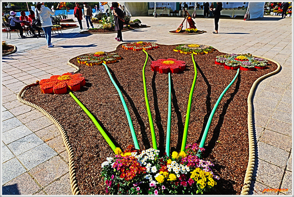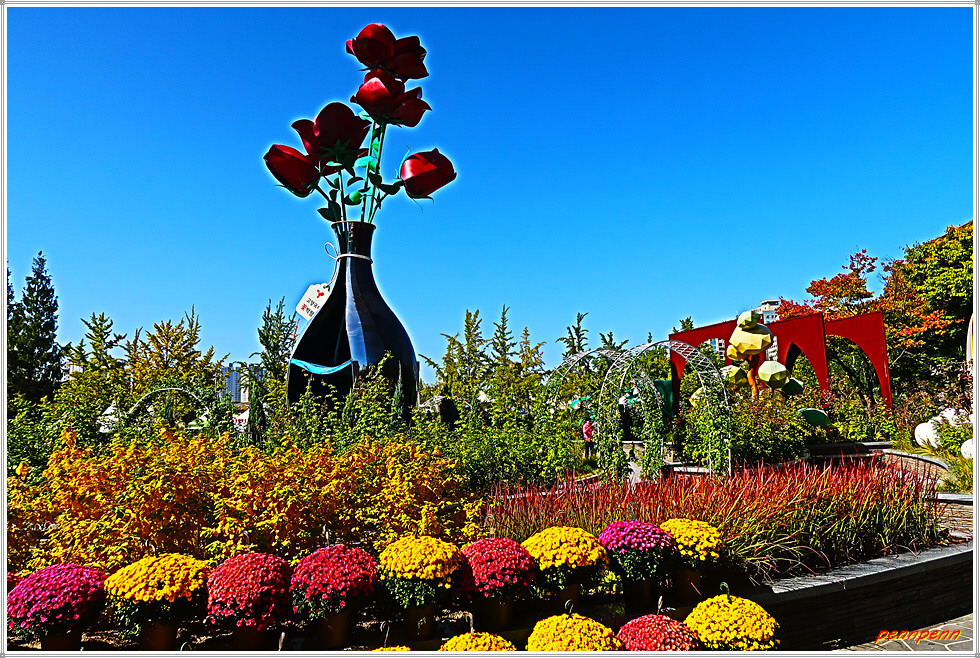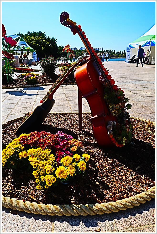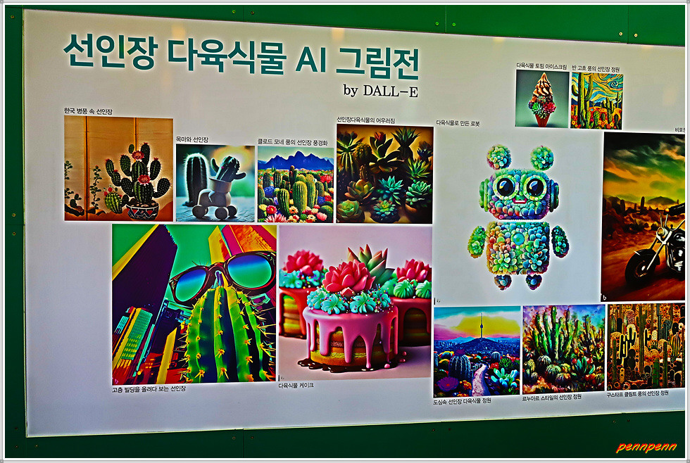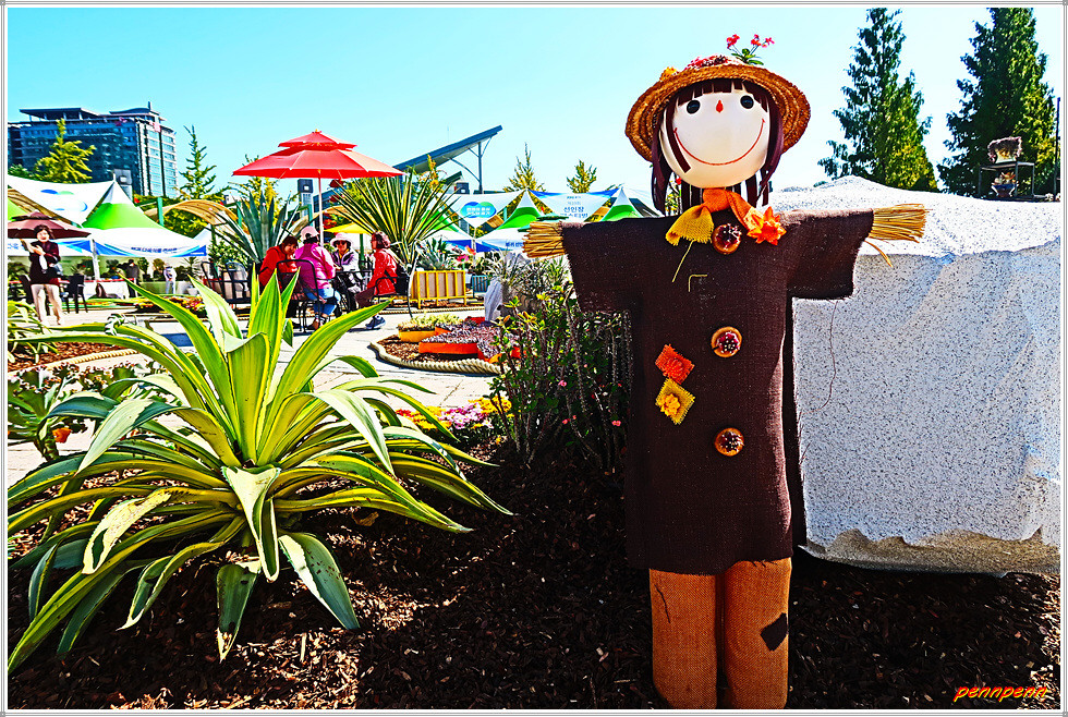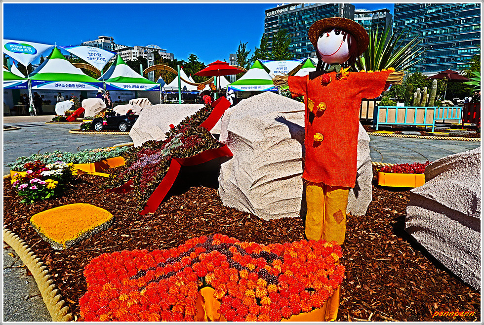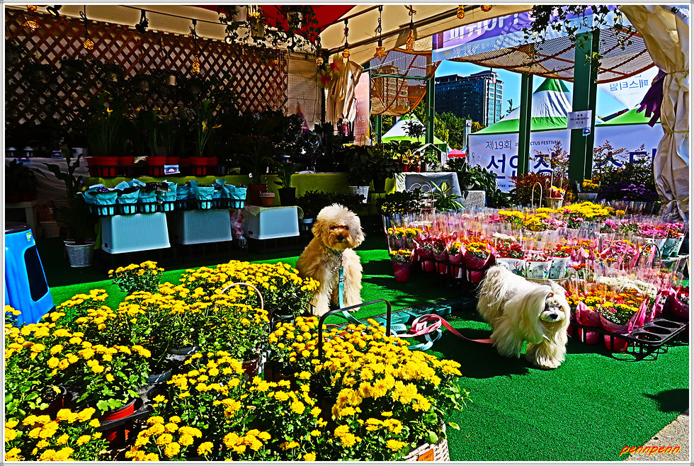 일산호수공원 주제광장에서는 선인장과 다육식물을 그림으로 표현한 그림전이 열리고 있는데, 그림의 색채가 매우 화려하네요. 그리고 늘어선 상점에서 다양한 선인장을 전시판매하고 있고, 공터에도 선인장을 활용한 다채로운 조형물로 눈을 즐겁게 만듭니다. 선인장전시장 옆에는 화훼농가에서 재배한 각종 국화를 전시하고 있더군요.