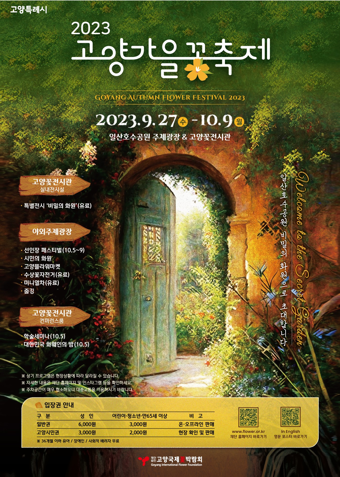 2023 고양가을꽃 축제(제10회)가 일산호수공원 고양꽃전시관 및 주제광장 일원에서 2023. 9. 27부터 10. 9까지 13일간 개최되고 있습니다. 이번 행사는 경기도농업기술원과 함께하는 선인장·다육 전시(선인장 페스티벌), 시민참여정원, 고양플라워마켓, 수상꽃자전거, 체험이벤트 등 다채롭게 진행 중입니다. 단 야외전시장은 무료이며 실내전시관의 입장료는 6,000원(어린이와 노인은 50% 할인)입니다.