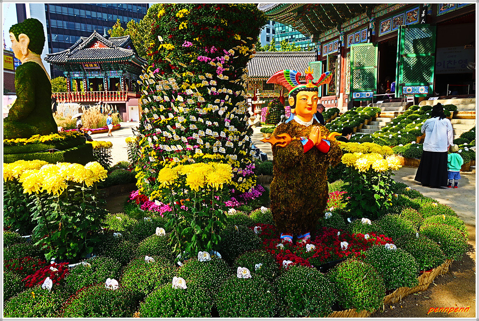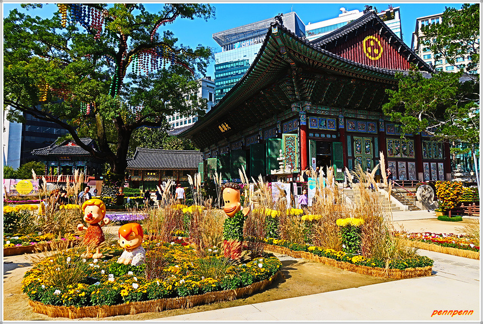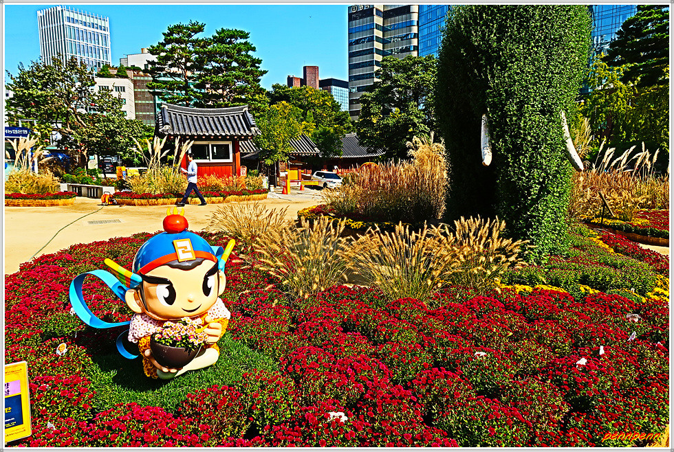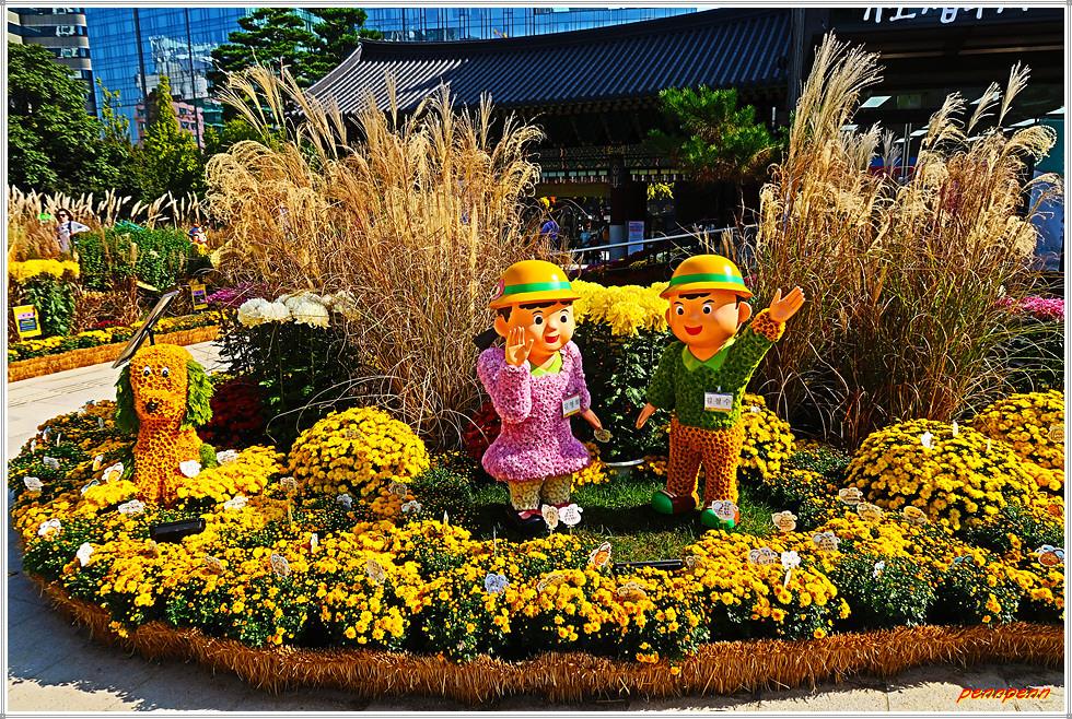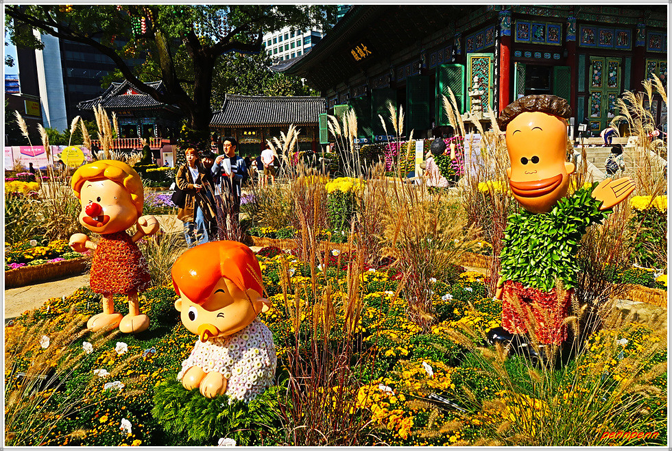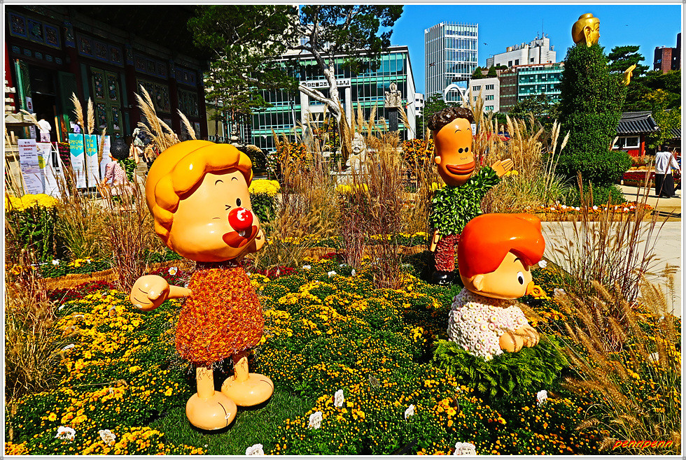 제13회 조계사 국화향기 나눔전 “시월국화는 시월에 핀다더라” 개막식이 지난 10월 10일개최되어 앞으로 한 달간 열리는데, 금년에는 화단에 다양한 캐릭터들을 많이 설치해 사진 찍는 이들을 즐겁게 만듭니다. 이들 캐릭터 중에는 관세음보살, 동진보살과 청사자, 아빠 코끼리 등 불교와 관련된 것도 있지만 초등학교 교과서에 나오는 철수와 영희, 그리고 1990년대 인기절정이었던 아기공룡 둘리가족의 캐릭터도 보여 매우 반가웠습니다.