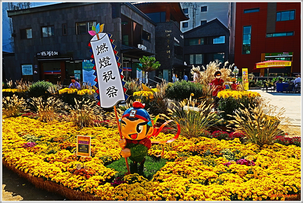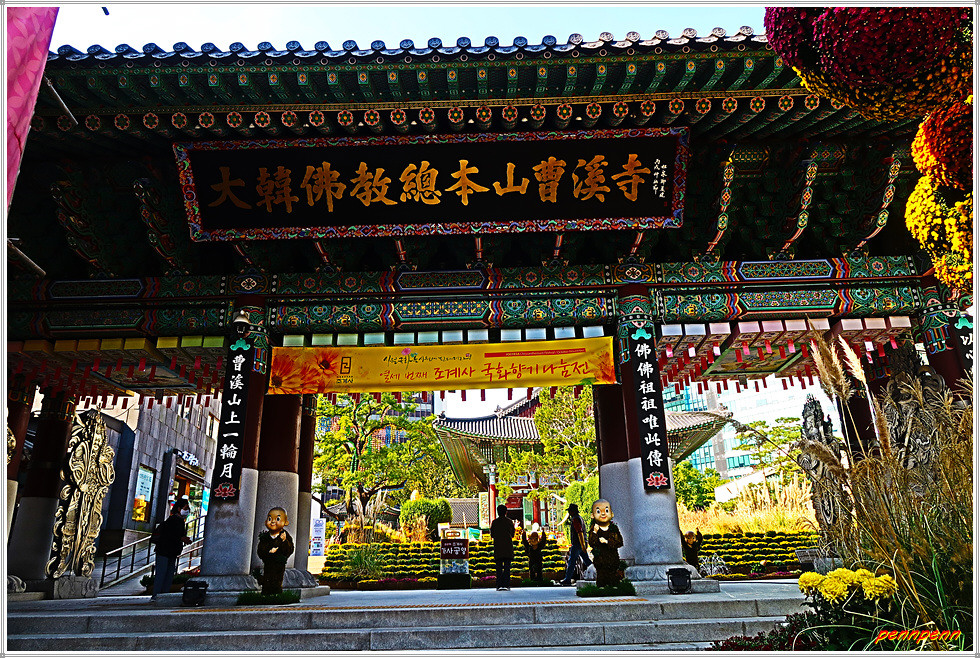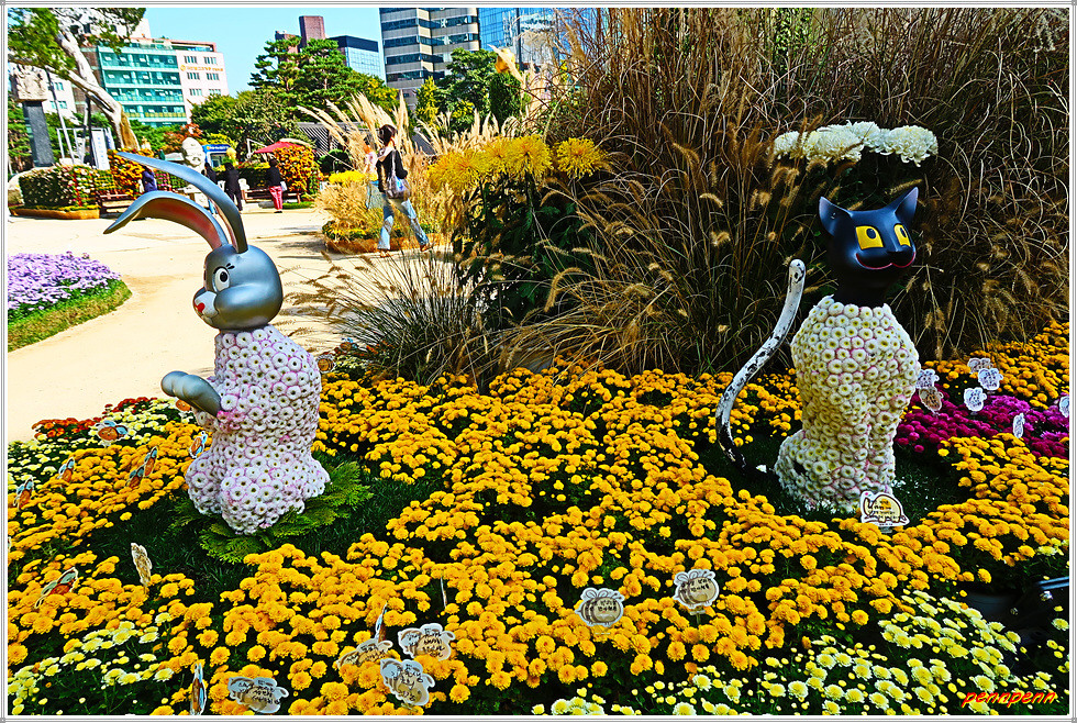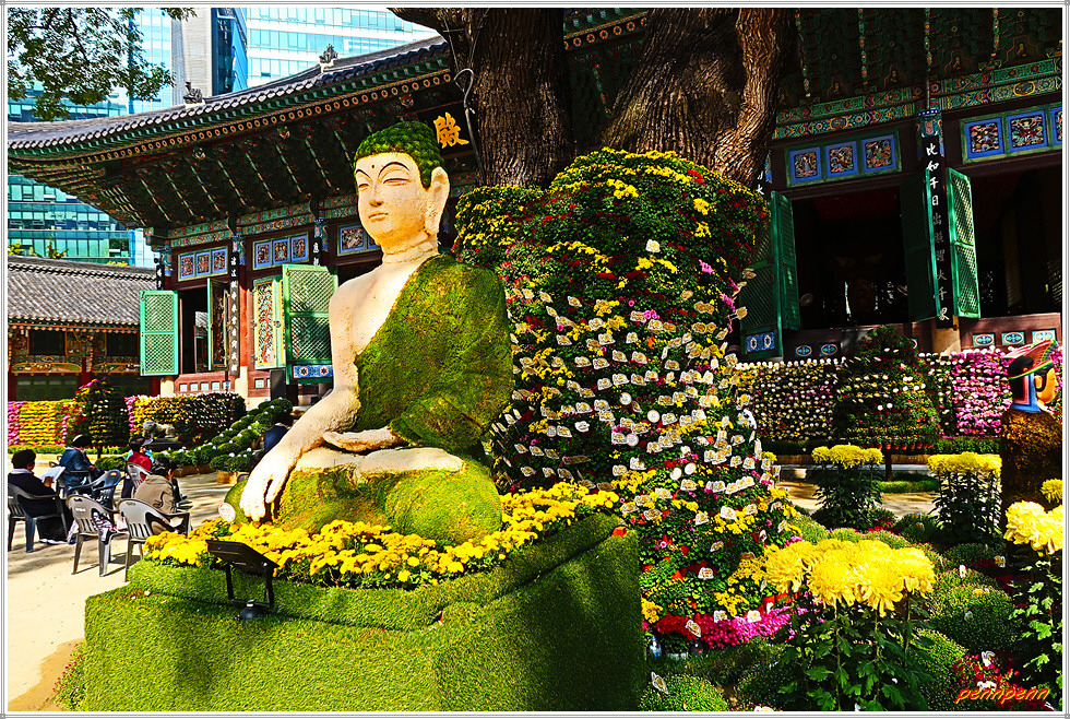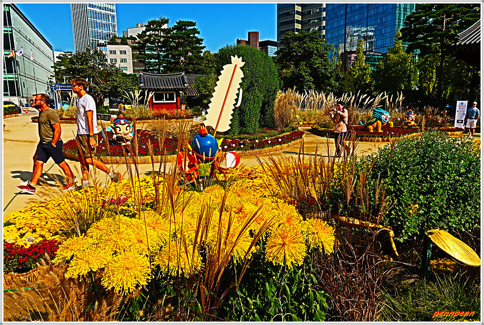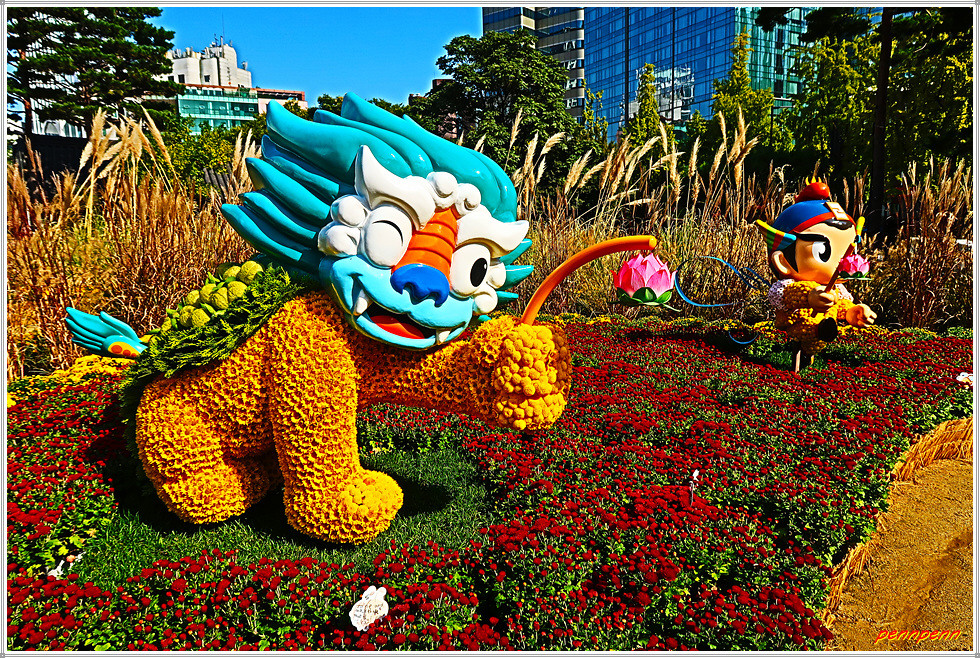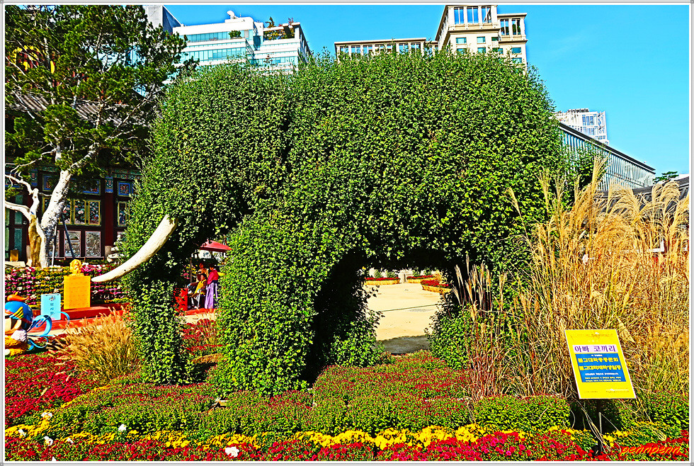제13회 조계사 국화향기 나눔전 “시월국화는 시월에 핀다더라” 개막식이 지난 10월 10일개최되어 앞으로 한 달간 열리는데, 금년에는 화단에 다양한 캐릭터들을 많이 설치해 사진 찍는 이들을 즐겁게 만듭니다. 이들 캐릭터 중에는 관세음보살, 동진보살과 청사자, 아빠 코끼리 등 불교와 관련된 것도 있지만 초등학교 교과서에 나오는 철수와 영희, 그리고 1990년대 인기절정이었던 아기공룡 둘리가족의 캐릭터도 보여 매우 반가웠습니다.