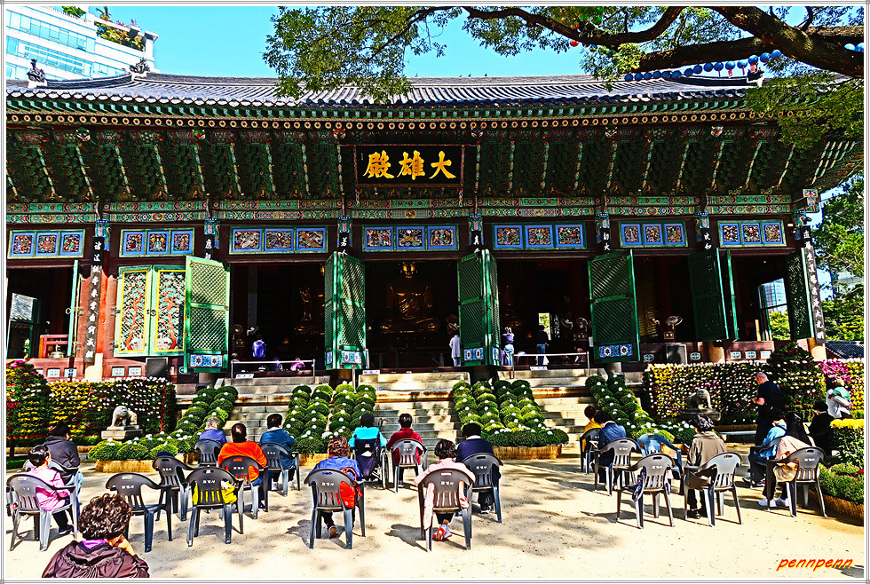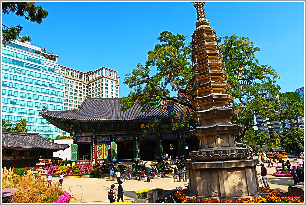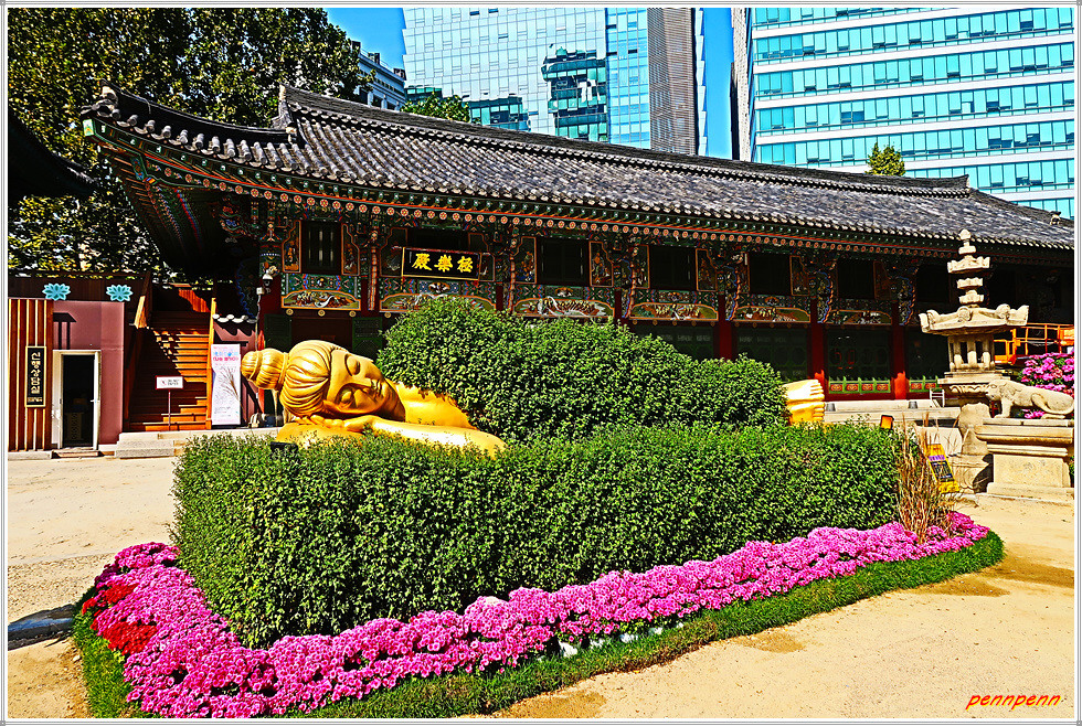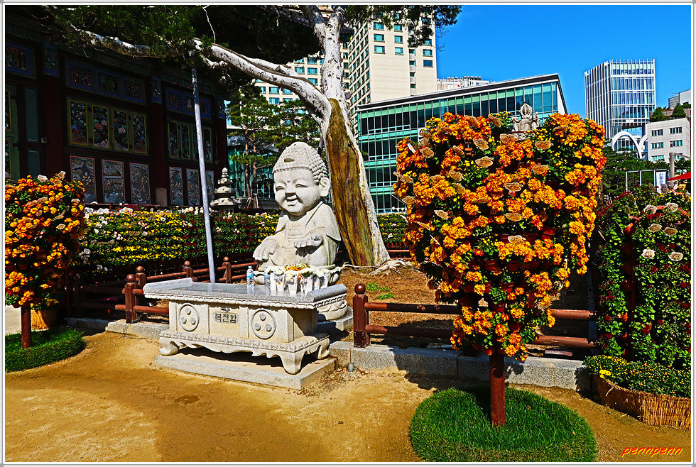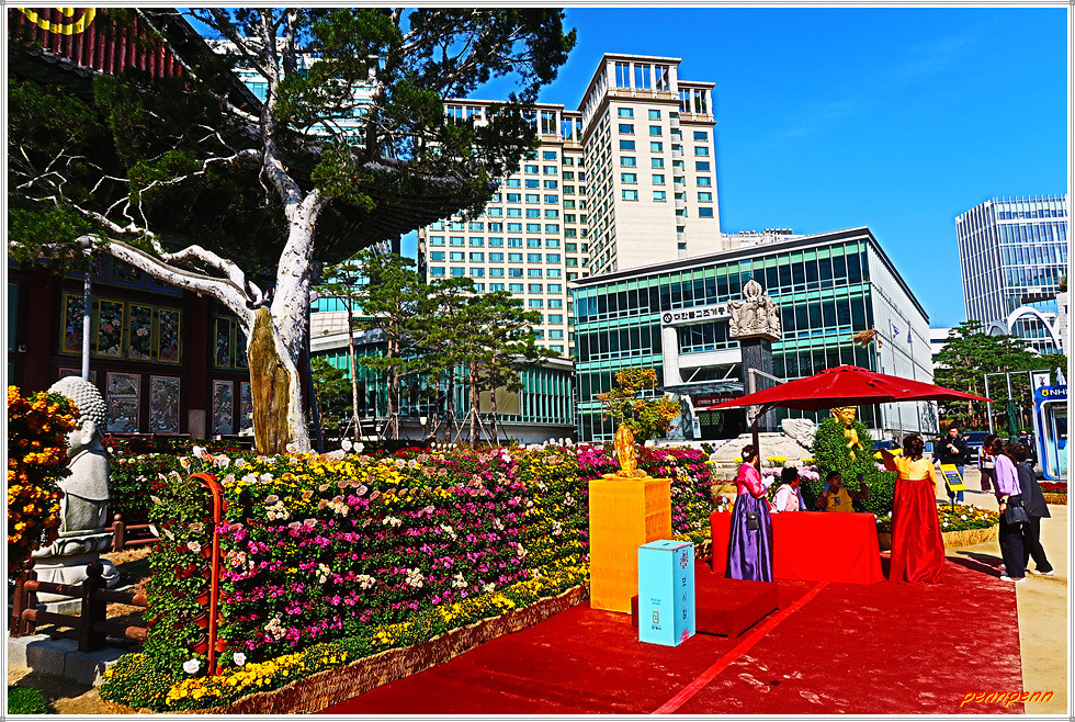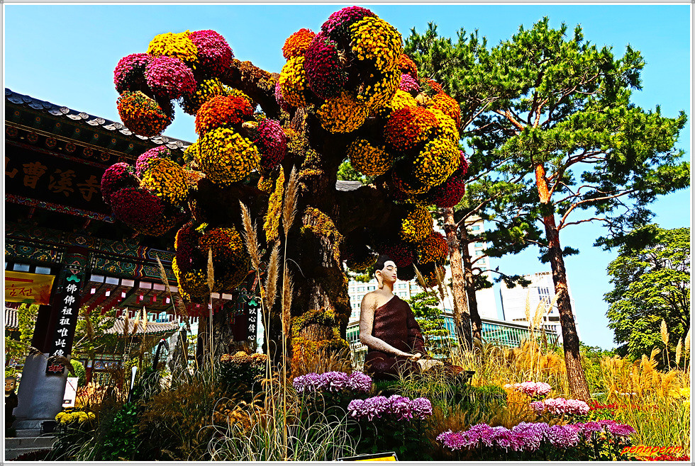 대웅전 좌측 와불 뒤에는 극락전이 있고, 대웅전 정면 맞은편에는 관음전이 있습니다. 극락전은 사찰에서 서방극락정토와 관련하여 아미타불을 봉안하는 불교건축물로 아미타전 또는 무량수전이라고도 합니다. 관음전은 관세음보살을 주불로 모신 사찰 당우를 지칭합니다. 조계사 국화향기 나눔전은 올해 13번째로 열리는데 매번 꽃의 배치와 주제 그리고 조형물이 달라 방문할 때마다 새로운 멋을 느끼게 됩니다.