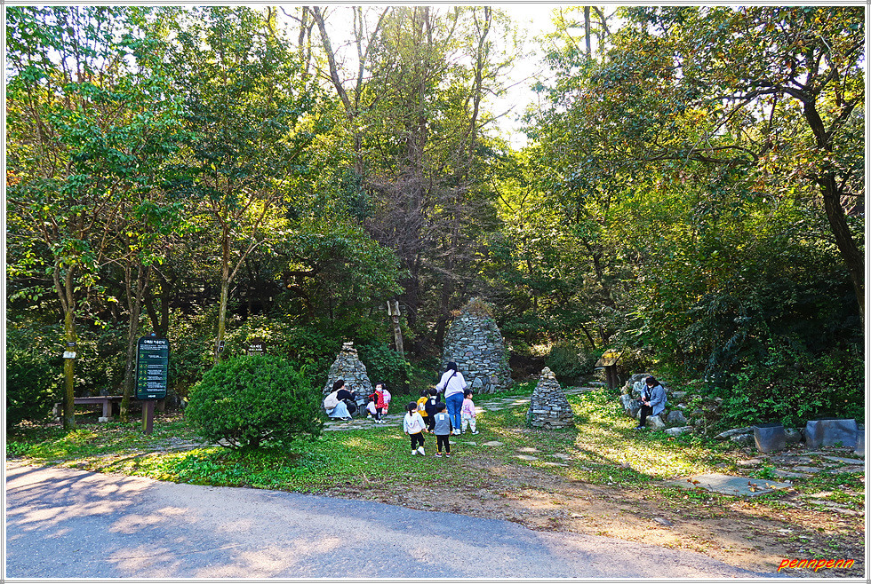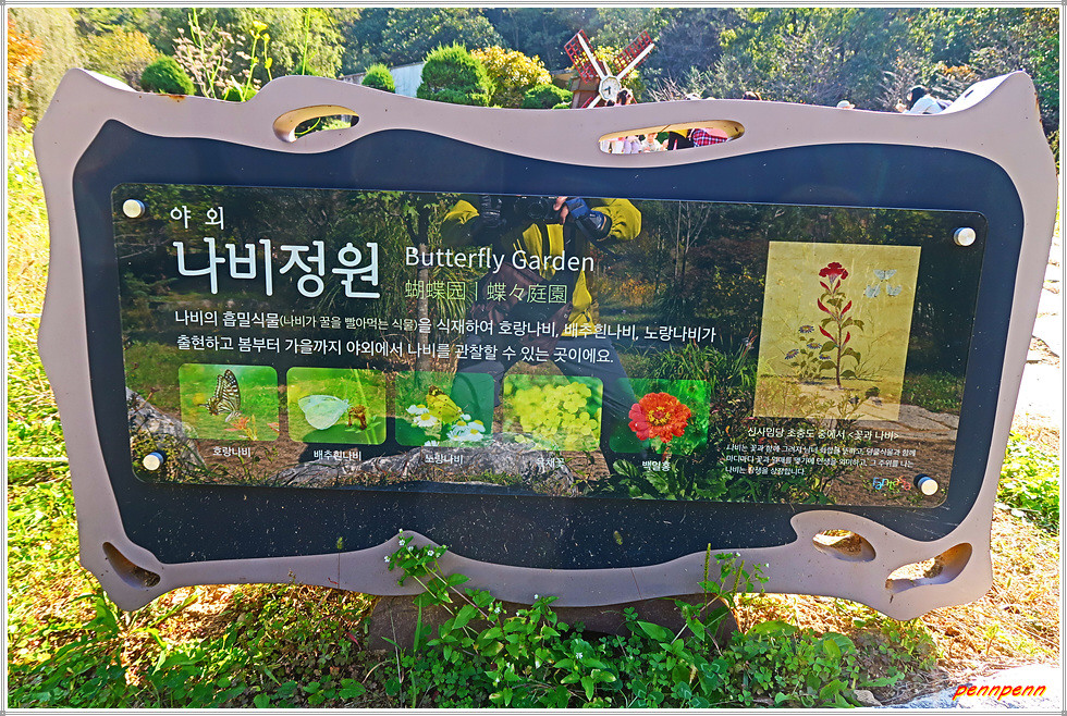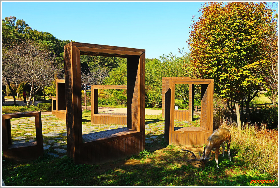 사각으로 만든 사진촬영액자틀을 뒤로하고 위쪽으로 오르면 나비정원인데 봄에는 튤립이 심어져 있었지만 지금은 풍차만 남아 매우 썰렁한 모습입니다. 안으로 더 들어가면 튼튼유아숲체험원인데, 이곳에는 구절초가 피어 있고 기린조형물도 세워져 있습니다. 붉은 알이 영그는 가막살나무는 처음 보았고, 붉은색과 노란색의 촛불맨드라미도 가을에 만나는 예쁜 꽃입니다.