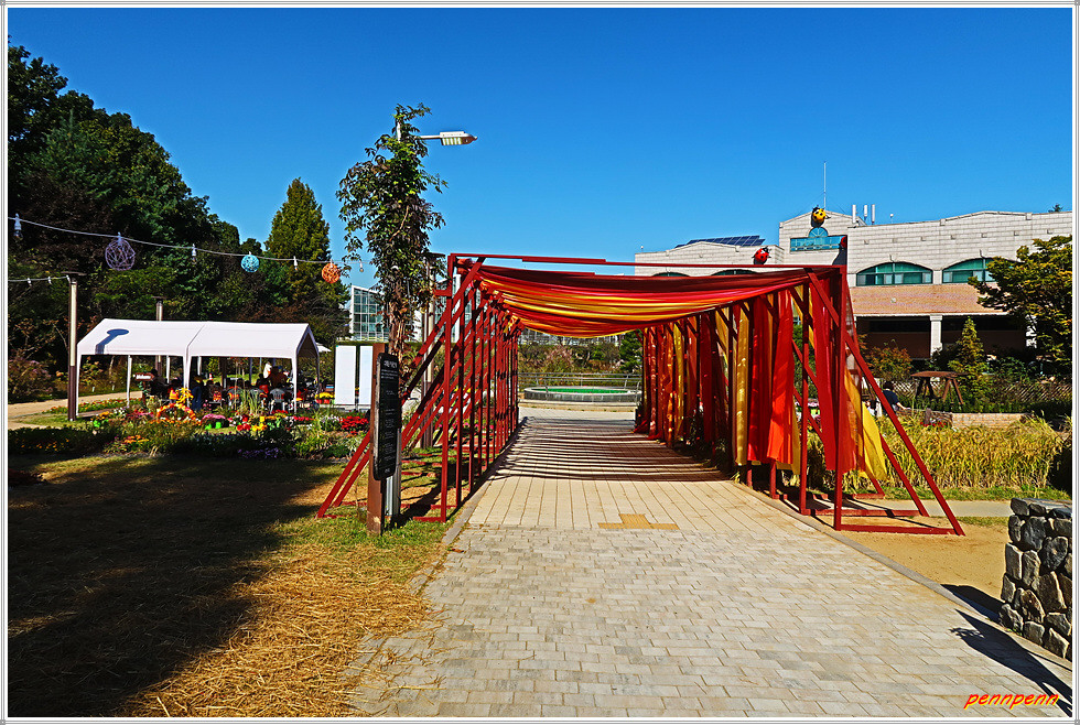 안으로 들어가면 우측에 부천식물원, 좌측에는 자연생태박물관이 있습니다. 사계절원을 지나면 농경유물전시관인데 그 앞에 아기자기한 화단이 조성되어 있고 보행로에는 임시로 터널을 만들어 분홍색 비단을 걸쳐 놓아 축제 분위기를 띄우고 있습니다. 관내 어린이집에서 원생들을 데리고 나와 현장학습을 하는 모습이 참 보기 좋군요.