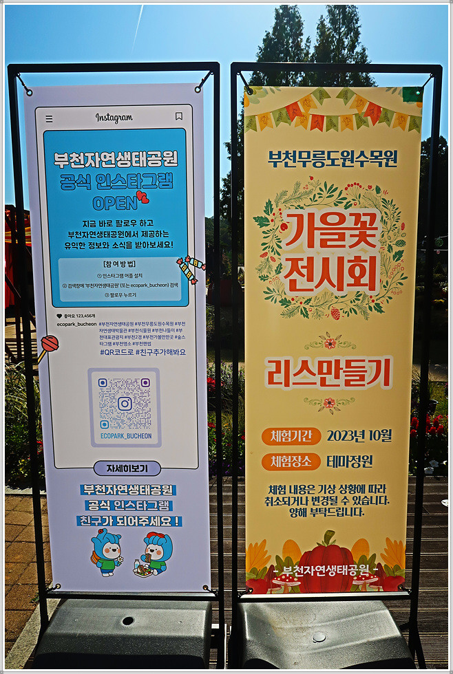 경기도 부천시 춘의동 소재 부천자연생태공원은 식물원과 박물관 및 수목원이 어우러진 체험형 종합 생태공원입니다. 이곳에는 부천식물원, 부천자연생태박물관, 농경유물전시관, 무릉도원수목원, 튼튼유아숲체험원이 있어 사계절 어느 때 방문해도 볼거리 및 즐길 거리가 가득합니다. 특히 가을을 맞이하여 10월에는 가을꽃전시회가 열리고 있습니다.