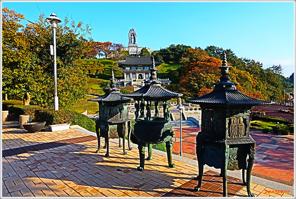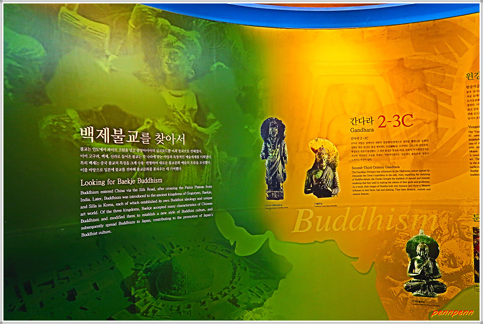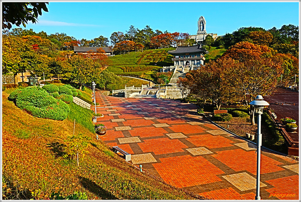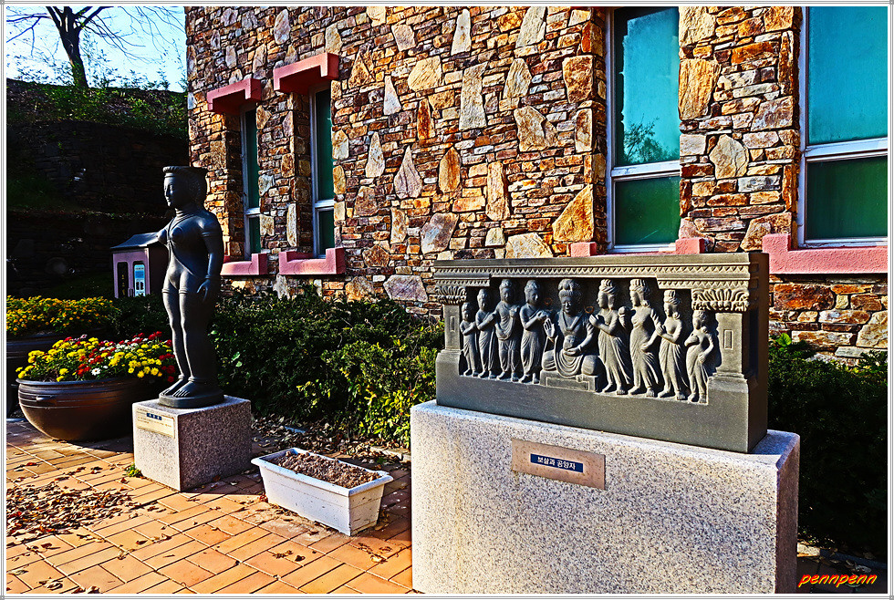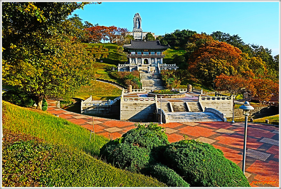 간다라유물관에서 아래쪽을 바라보면 만다라광장이 있고 계단중앙에는 부용루가 보입니다. 부용루는 참배 및 서해조망용 누각으로서 1층 석벽에는 간다라 양식의 불전도 부조조각이 23면에 걸쳐 부처님의 전생 인연담과 일대기가 생동감 있게 조각되어 있습니다. 부용루 위쪽에는 사면대불상이 있는데 이는 아미타불을 주존불로 모시고 관음.세지 보살을 좌우로, 그리고 마라난타 존자가 부처님을 받들고 있는 모습을 다른 한 면에 배치한 사면불로 약식 석굴사원 형식을 띤 독특한 형태의 사면불상(높이 23.7m)입니다.
