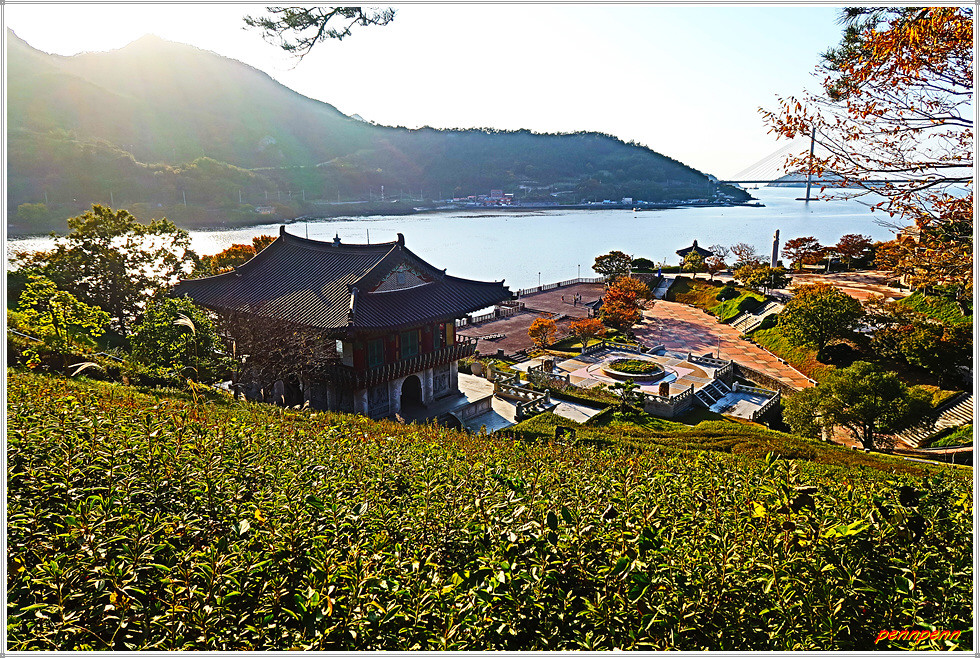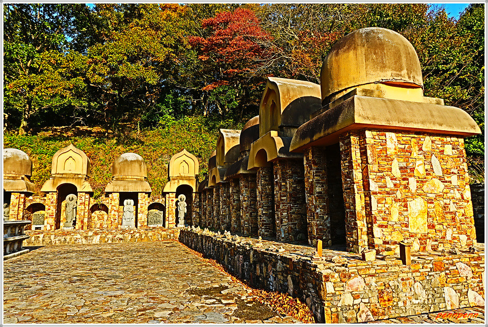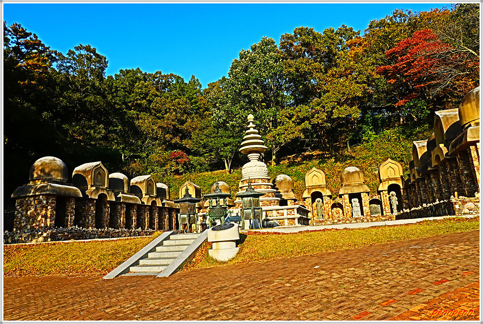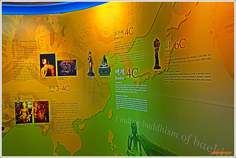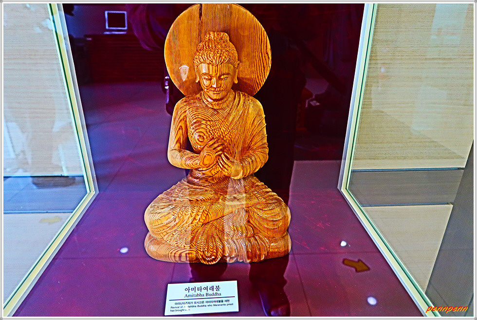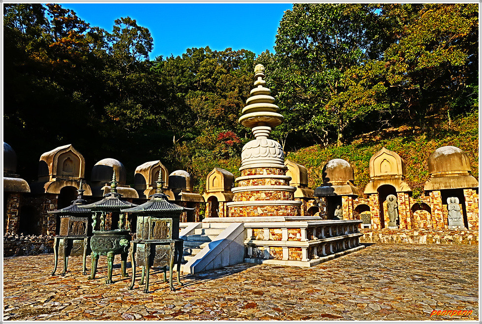 간다라유물관에서 아래쪽을 바라보면 만다라광장이 있고 계단중앙에는 부용루가 보입니다. 부용루는 참배 및 서해조망용 누각으로서 1층 석벽에는 간다라 양식의 불전도 부조조각이 23면에 걸쳐 부처님의 전생 인연담과 일대기가 생동감 있게 조각되어 있습니다. 부용루 위쪽에는 사면대불상이 있는데 이는 아미타불을 주존불로 모시고 관음.세지 보살을 좌우로, 그리고 마라난타 존자가 부처님을 받들고 있는 모습을 다른 한 면에 배치한 사면불로 약식 석굴사원 형식을 띤 독특한 형태의 사면불상(높이 23.7m)입니다.