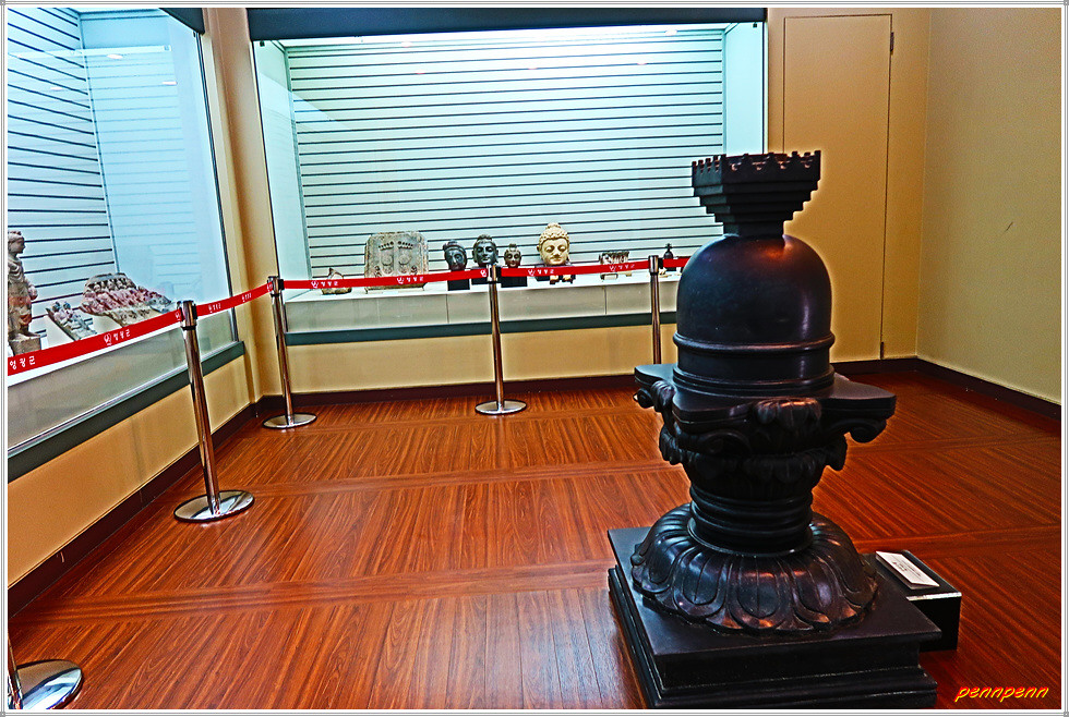 상징문 옆에는 존자정(尊者亭)이 있는데 정자에는 범종이 놓여 있습니다. 상징문 우측에는 관리사무소가 있고, 그 옆에는 간다라유물관이 있는데, 이는 대승불교문화의 본 고장인 간다라의 2C-5C 경 불전도 부조 및 불상 등 진품유물을 전시하여 간다라 불교 문화예술의 특징적 요소를 직접 관람하고 느낄 수 있도록 하였으며, 그 건축양식도 간다라 건축 요소를 담아내도록 하였습니다.