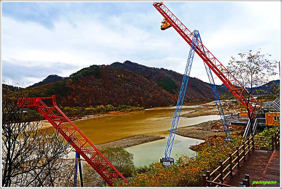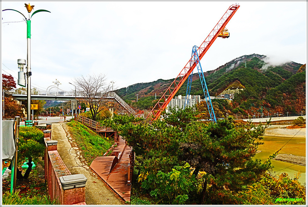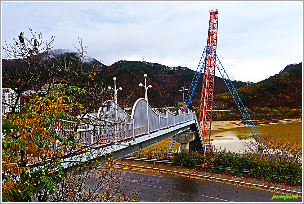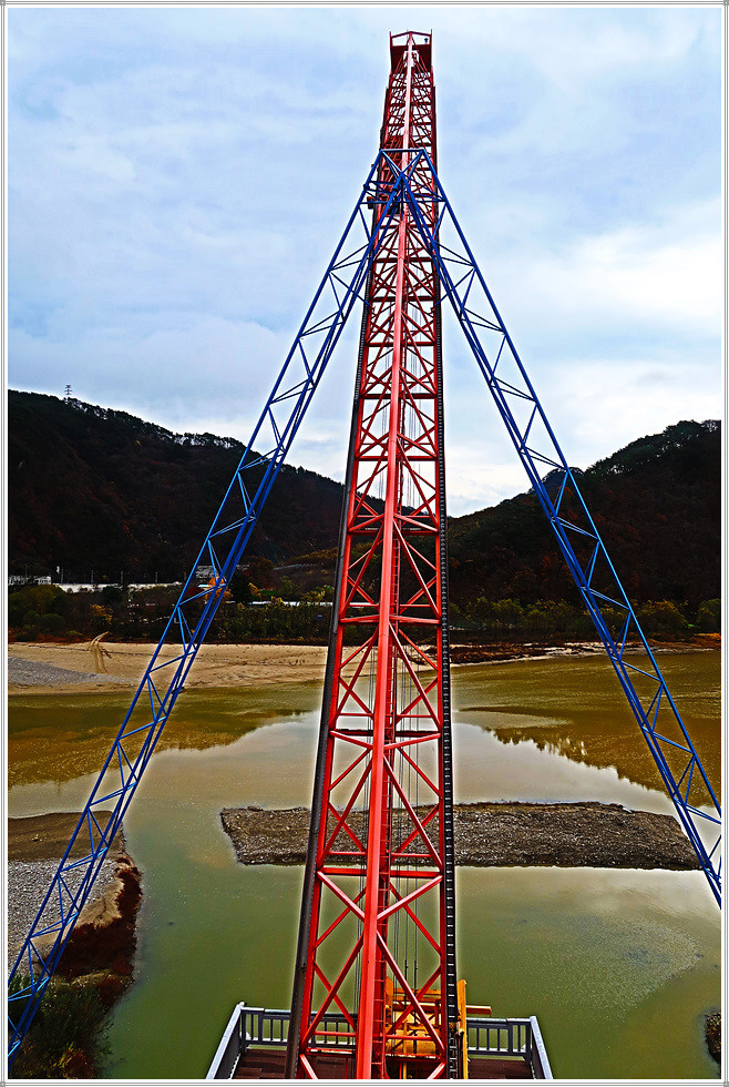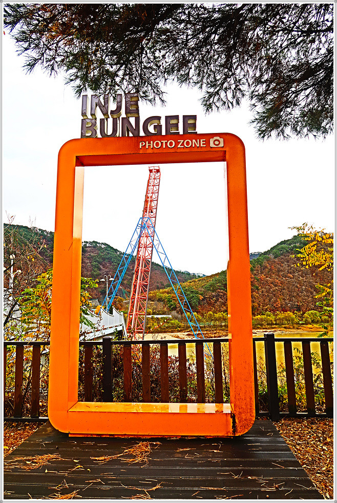 합강교 좌측 소양강변에는 인제번지점프대가 있는데, 60도 각도의 타워로 양쪽을 강철 구조로 지지하고 있고 번지점프대 육교위에 서면 인제읍내가 한눈에 내려다보입니다. 번지점프 높이는 설치 당시 국내 최고인 63m입니다.