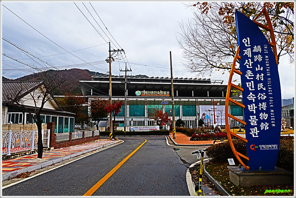 원래 목적지는 자전거(보행자)전용도로를 계속 가는 것이 맞지만 44번국도(46번국도, 31번국도)를 횡단해 인제읍 소재 인제산촌민속박물관을 보기로 합니다. 인제교차로에는 “하늘내린 인제”라는 글씨가 세워져 있고 조금 더 진입하면 인제쌈지공원을 만납니다. 쌈지공원 좌측으로 들어가면 좌측에 인제산촌민속박물관입니다.