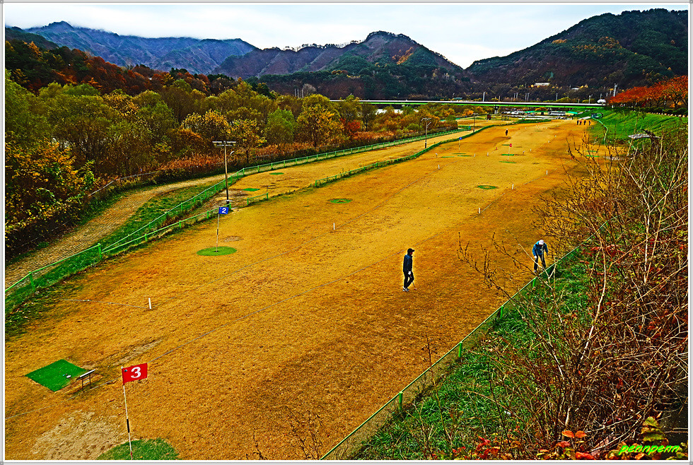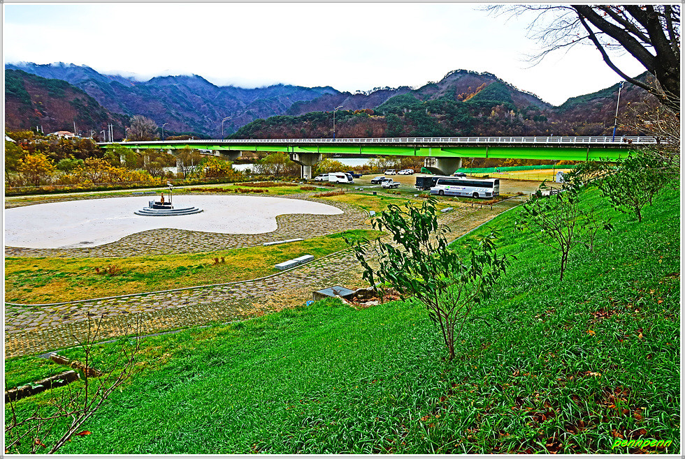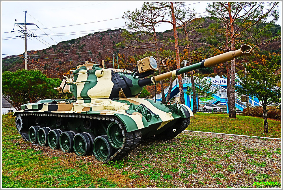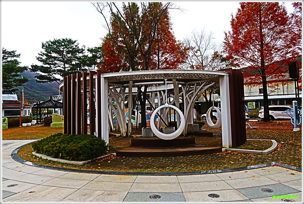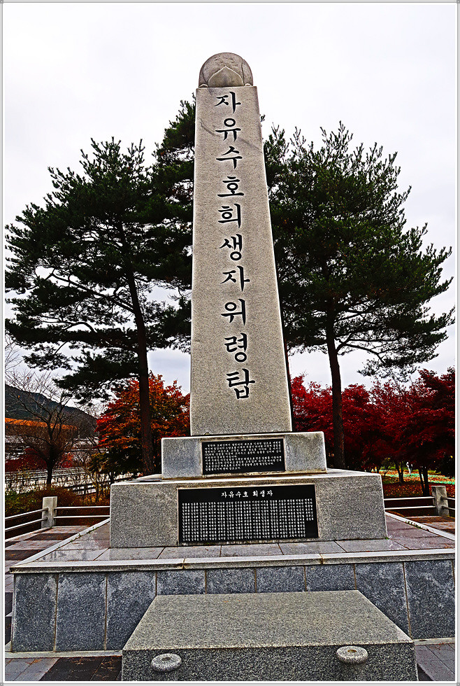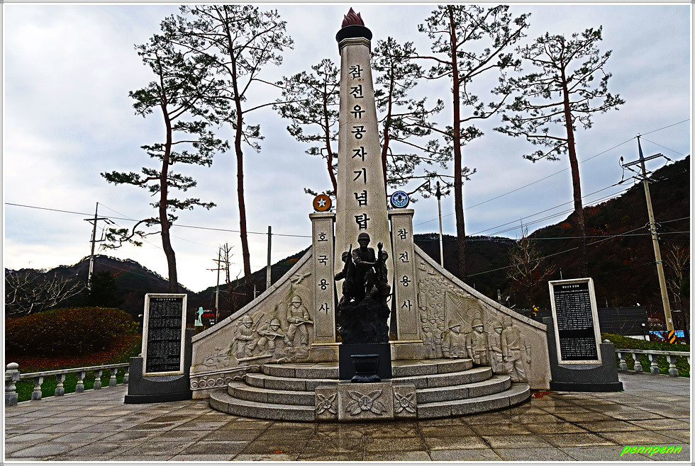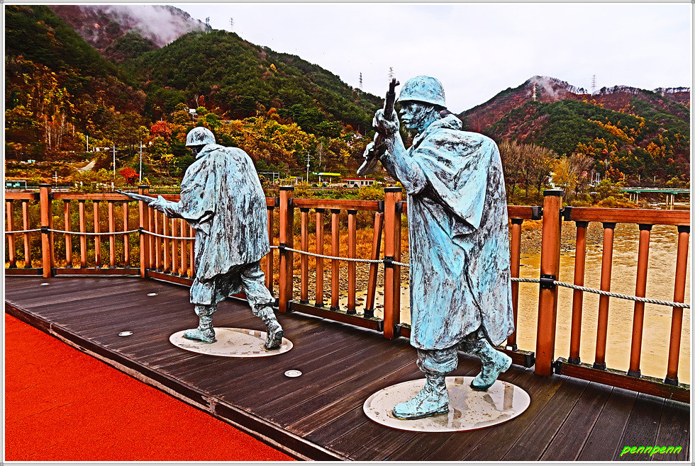 인제산촌민속박물관과 박인환문학관 및 2023한국현대조각초대전을 둘러보고 소양강변의 자전거 전용도로로 다시 되돌아옵니다. 나무로 만든 다리를 건너니 강변 둔치에 조성된 그라운드 골프장에서 사람들이 골프를 즐기고 있습니다. 내설악무궁화 동산 옆에는 절정의 단풍나무 몇 그루가 여행자를 유혹하는군요. 인제 자유수호희생자 위령탑은 6.25전쟁 당시 민간인신분으로 조국과 향토를 지키기 위해 투쟁하다가 희생된 175위의 거룩한 희생정신을 기리기 위해 세운 위령탑입니다. 이웃한 참전유공자기념탑은 6.25전쟁 및 베트남 전쟁에서 순국한 인제출신 호국용사를 기리는 탑으로 기념탑 옆에는 전차가 전시되어 있네요.