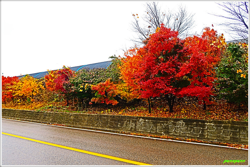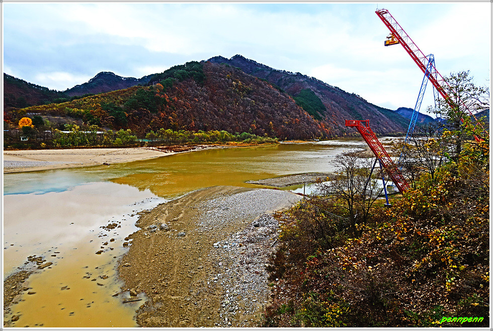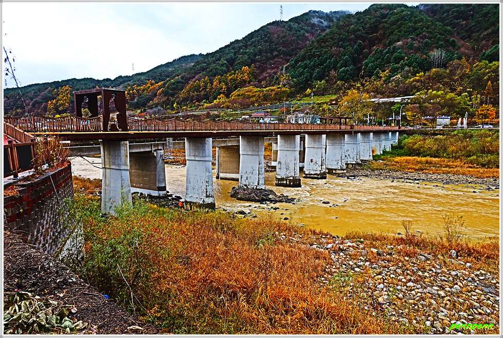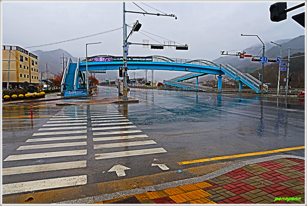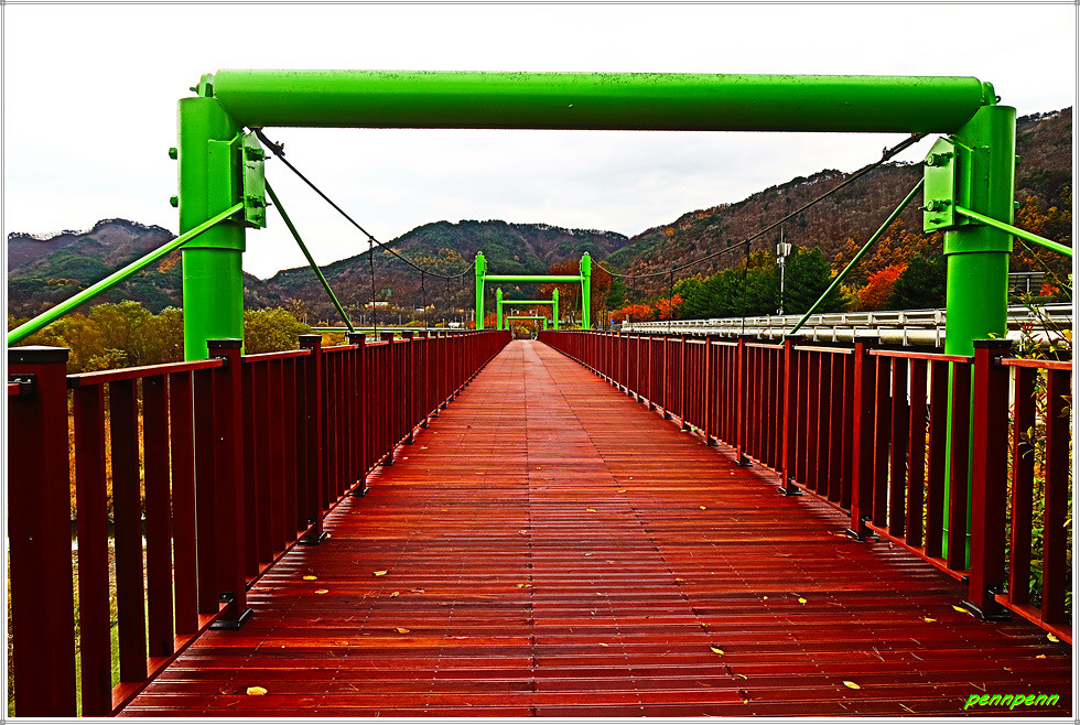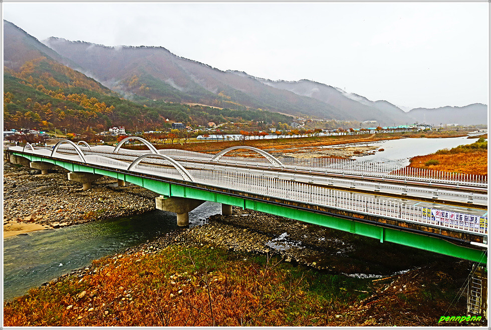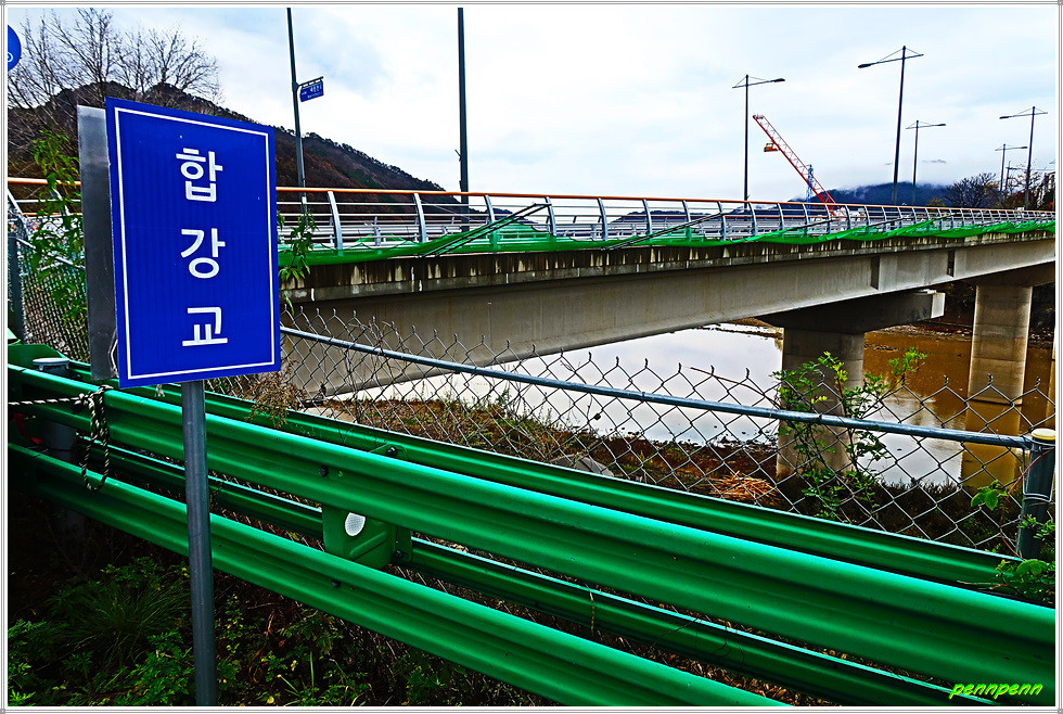 리빙스턴교를 뒤로하고 직진합니다. 중앙종합기술이 있는 주변에는 아름다운 단풍나무가 보이는군요. 어느새 비가 점점 잦아들더니 이제 우산을 접고 걸을 수 참 다행입니다. 덕산교를 건너 인제축협가축경매시장, 농업기계전시장을 경유해 합강교를 건넙니다. 합강교는 인북천에 걸린 다리로 여기서 인북천은 소양강으로 합류하지요.