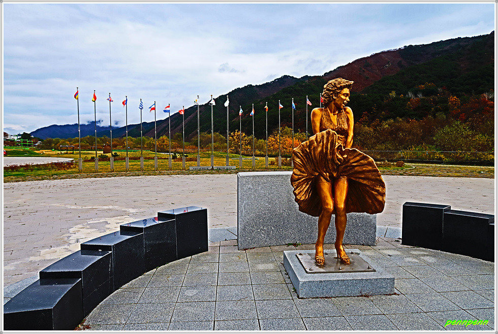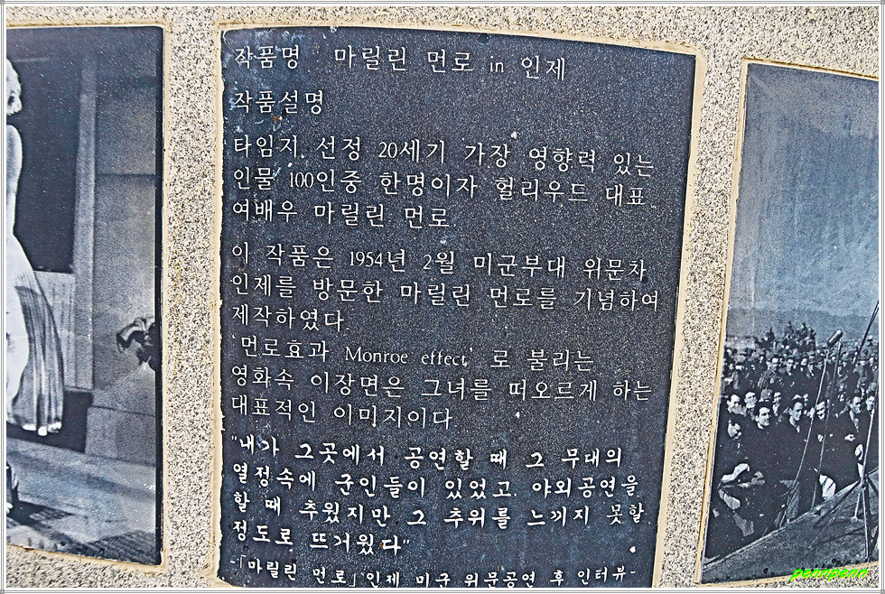 살구미대교 아래에는 문화광장 및 체육시설이 있는데 이곳이 14코스의 종점입니다. 문화광장에는 미국 배우 마릴린 먼로의 청동조각상이 있는데 먼로가 1954년 미군위문 차 인제를 방문한 것을 기념하여 세운 동상입니다.