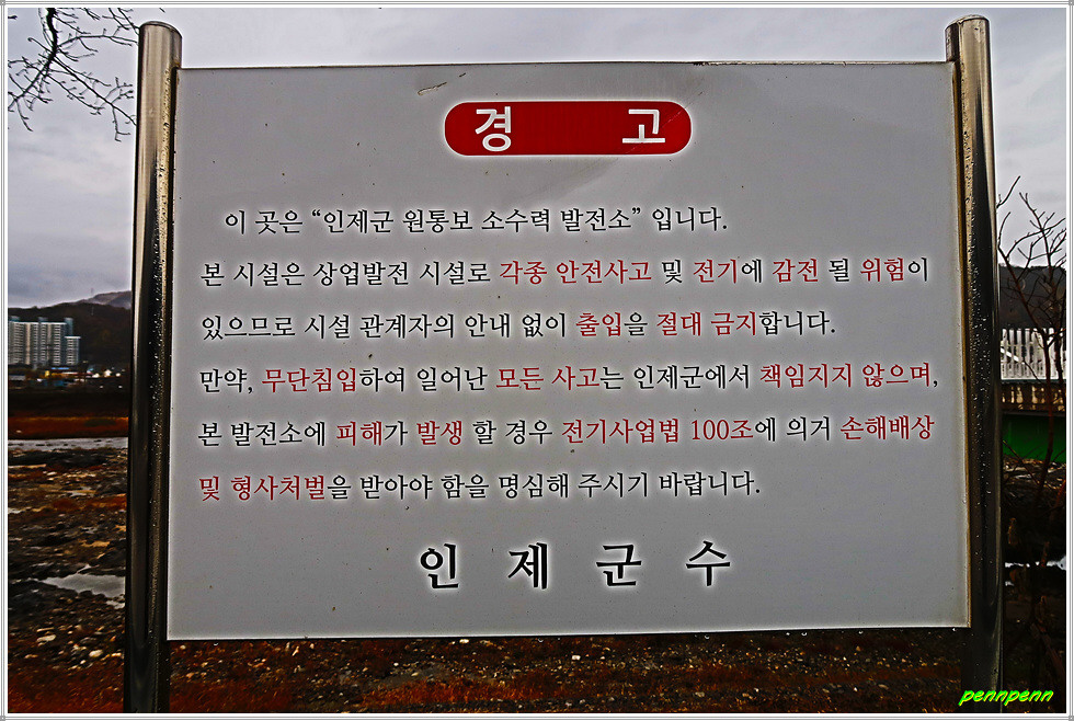 14코스 출발점은 인제군 북면 원통리 소재 원통교입니다. 원통교 북단 원통교차로 주변에는 대형 식자재마트가 있고 국도인 설악로는 횡단보도 대신 육교로만 건널 수 있어 보행자들은 다소 불편합니다. 비가 추적추적 내려 우산을 쓴 채 사진을 찍으려니 카메라에 물이 스며들까봐 무척 조심스럽네요. 육교에서 바라보는 원통교의 모습이 시원한데 원통교를 건너며 바라본 북천은 하천의 폭이 매우 넓어 보입니다. 이곳에는 원통보 소수력 발전소가 있는 모양이로군요.