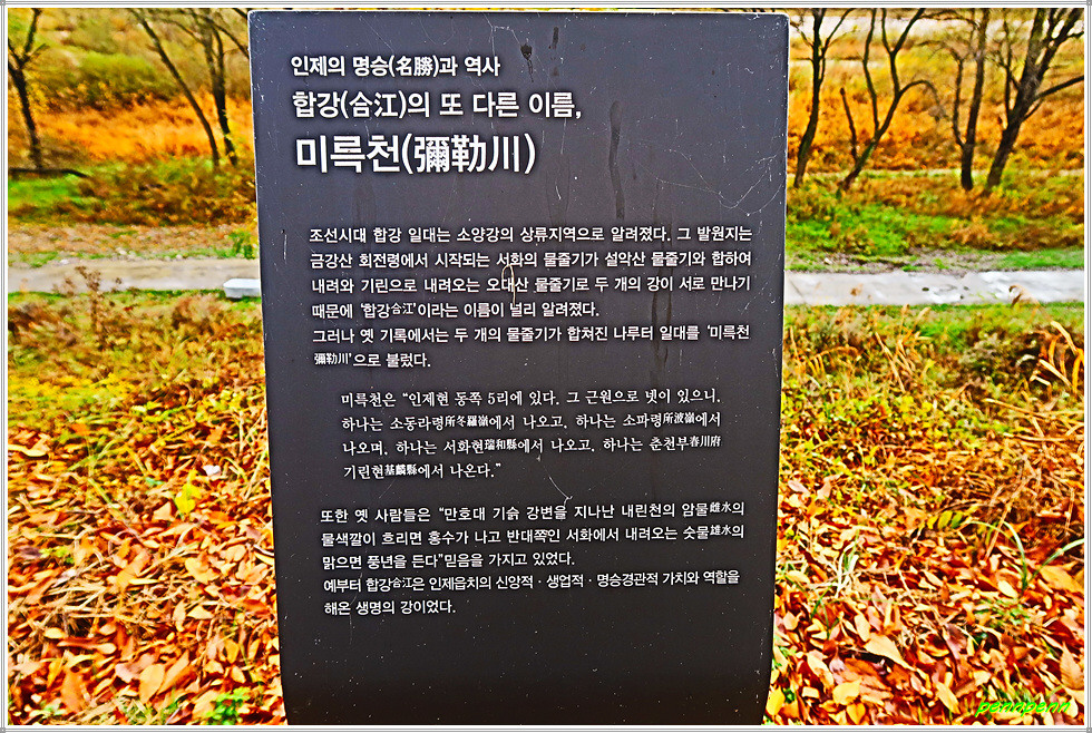 번지점프대를 지나 소양강변의 자전거 및 보행자 전용로를 걸어갑니다. 길섶에는 합강의 유래에 관한 안내문이 있는데 이 합강을 과거에는 미륵천이라고 불렀다는군요. 또한 합강정 앞 강에는 합강섬이 있었지만 1930년 대홍수로 인해 섬이 사라졌다고 합니다.