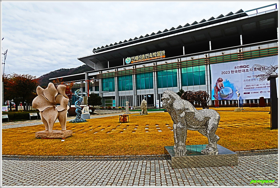 인제군 인제읍 상동리 소재 인제산촌민속박물관은 사라져 가는 인제군 산촌의 민속문화를 체계적으로 보존, 전시, 교육, 연구하기 위하여 2003년 설립한 전문박물관으로 2011년부터는 인제 출신의 시인 박인환을 주제로 하는 박인환문학관을 증축하여 운영하고 있습니다. 마침 박물관 뜰에는 2023한국현대조각초대전이 열리고 있어 조각 작품들을 두루 살펴보았습니다.