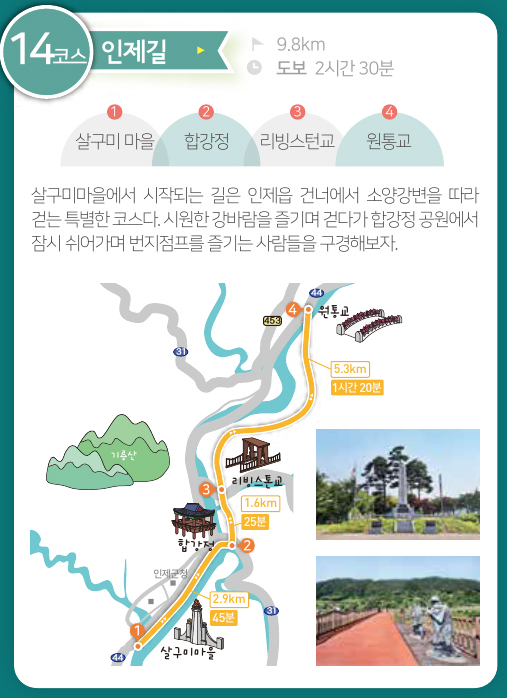 평화누리길 인제 14코스 “인제길은”은 원통교에서 출발해 리빙스턴교 및 합강정을 거쳐 살구미교에 이르는 9.8km의 도보길입니다. 이 코스에서는 리빙스톤교, 합강정, 인제산촌민속박물관, 박인환문학관을 만날 수 있습니다.