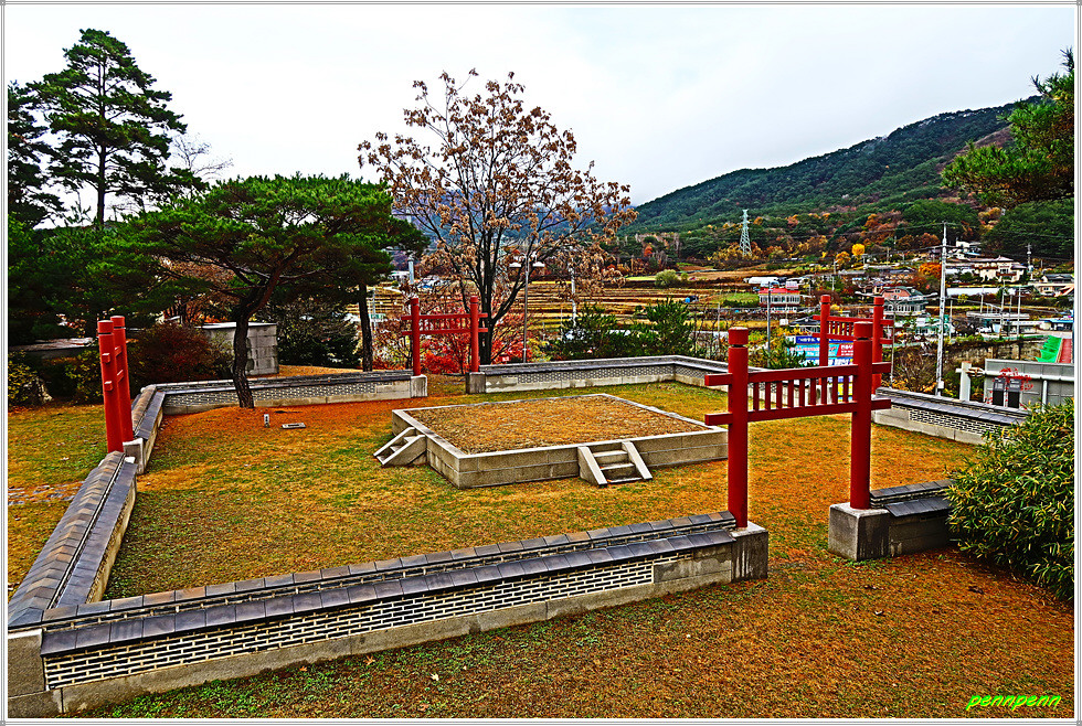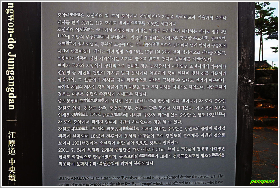 합강정 옆에는 신성한 장소를 의미하는 홍살문이 세워진 제단이 있는데 이는 강원도 중앙단입니다. 중앙단은 조선 시대 각 도의 중앙에서 전염병이나 가뭄을 막아내기 위해 억울하게 죽거나 제사를 받지 못하는 신을 모시고 별여제를 지냈던 제단으로 강원도 중앙단은 1843년 전후까지 별여제를 지냈던 것으로 전해집니다.