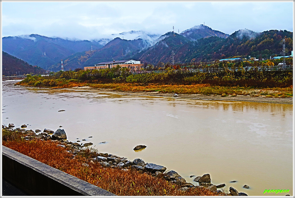 원통교를 건너 우측 북천의 제방길을 따라갑니다. 길섶의 공중 화장실은 매우 깨끗하네요. 좌측 산허리에는 안개구름이 끼어 있어 운치가 좋습니다. 인제농협미곡처리장을 지나갑니다. 강변제방길을 지나 강변도로를 걸어가는데 이쯤에서 북천은 인북천으로 합쳐져 더 큰 물줄기를 구성하는군요. 이번에 내린 비로 인해 하천의 물이 황토색으로 변한 모습입니다. 합강2교 옆 송전철탑과 인제군농업기술센터를 지나면 리빙스톤교에 도착합니다.