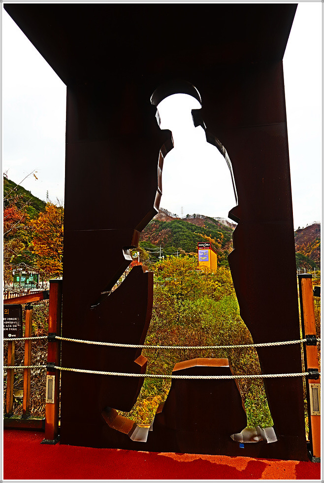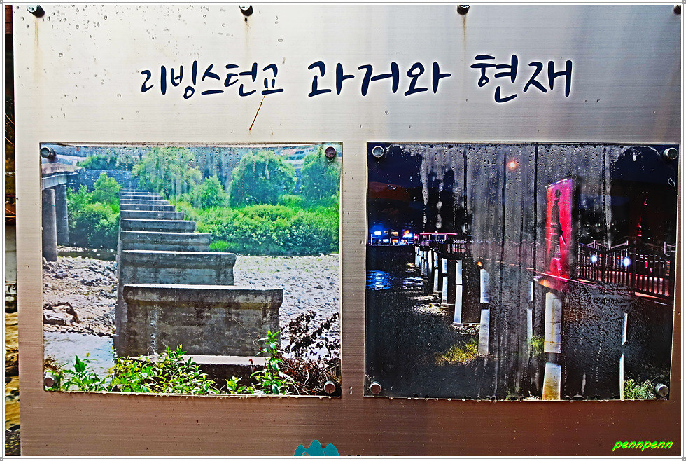 교량 중간부문에는 원통형의 조망대가 있고 조금 전에 보았던 것과 동일한 서서 작전 중인 2명의 군인과 대문 같은 구조물이 재현되어 있습니다. 다리를 건너니 리빙스턴교 관련 안내자료가 화보형식으로 걸려 있네요.