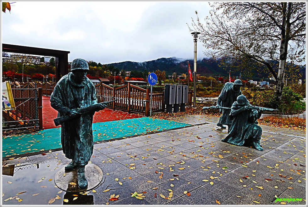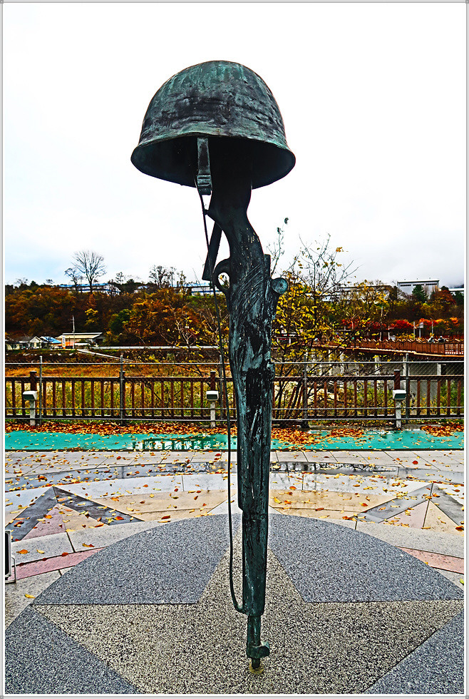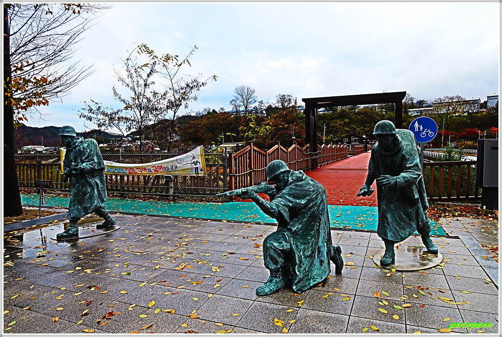 리빙스톤교 앞에는 쪼그려 앉은 채 작전을 수행하는 군인 3명의 조형물과 리빙스턴교의 유래비가 세워져 있습니다. 그 옆에는 총과 철모를 이용해 상징조형물을 설치해 두었는데 소총 꼭대기에 철모를 올려놓은 모습은 평화의 댐 비목공원에 있는 총과 철모를 연상시킵니다.