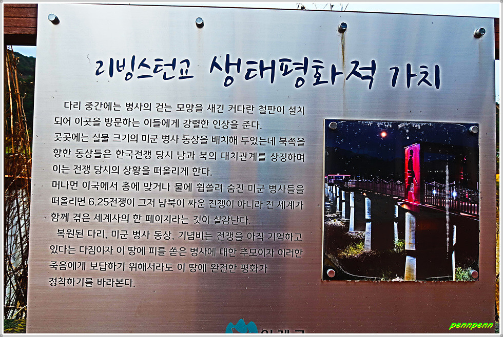 리빙스턴교는 미국이 비록 유엔군으로 참전했지만 한미가 혈맹임을 보여주는 상징적인 교량입니다. 이 다리는 강원도 평화누리길 인제 14코스가 지나가는 곳에 있어 평화누리길을 걸으며 자유와 평화 그리고 희생정신이 깃들어진 리빙스턴교의 역사적 가치를 다시금 생각해보는 시간이 되기를 바랍니다.