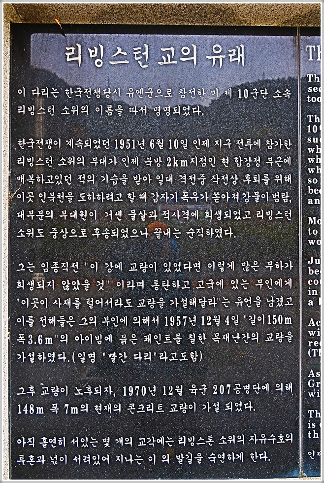 인제군 인제읍 합강리와 덕산리를 잇는 리빙스턴교는 한국전쟁 당시 유엔군으로 참전한 미국 리빙스턴 소위의 이름을 따서 만든 다리입니다. 인제 지구 전투에서 북한군과 교전중이던 리빙스턴 소위가 이끄는 유엔군 부대가 적의 기습을 받아 작전상 후퇴를 위해 인북천을 도하할 때 갑자기 폭우가 쏟아져 강물이 범람, 대부분의 부대원이 거센 물살과 적 사격에 희생되었고 리빙스턴도 중상으로 후송되었으나 끝내 순직하였습니다. 임종 직전 "이 강에 교량이 있었다면 부하가 희생되지 않았을 것"이라며 고국에 있는 부인에게 "이곳에 사재를 털어서라도 교량을 가설해달라"는 유언을 남감에 따라 1957년 12월 교량을 가설하였으며, 일명 "빨간 다리"라고도 부릅니다.