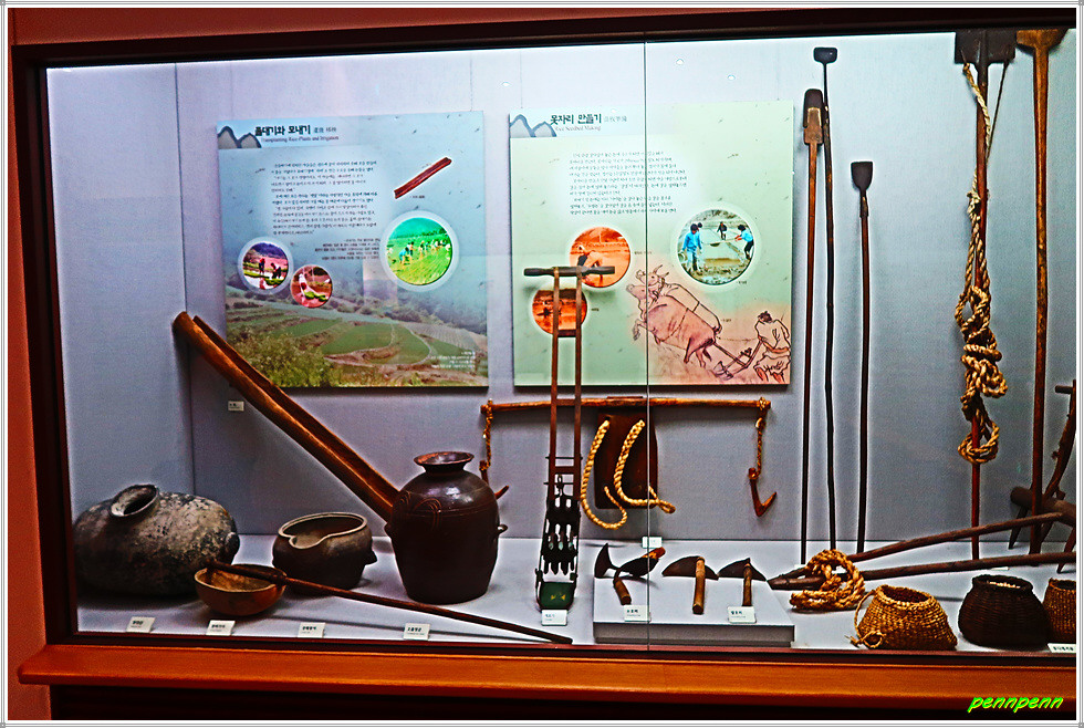 박물관 야외정원에는 많은 조각작품이 있는데 이들은 “조각과 문학-가을의 이야기”라는 주제로 개최 중인 2023 한국현대조각초대전 인제초대전(2023. 10. 7-11. 12)입니다. 그리고 정원에는 상설조각작품도 여러 점(6점)이 있습니다. 박물관 좌측에는 나무를 이용해 생활용품을 만들던 갈이틀을 복원해 놓았더군요.