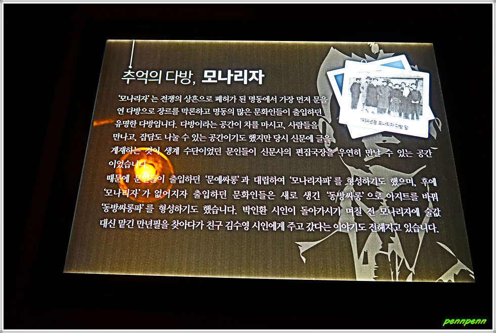 《모나리자》는 전쟁으로 폐허가 된 명동에서 가장 먼저 문을 연 다방으로 장르를 막론하고 명동의 많은 문화인들이 출입하던 유명한 다방입니다. 예술인들은 이곳에서 신문사 편집국장을 만날 수 있는 공간이기도 했습니다. 박인환 시인은 작고하기 며칠 전 술값대신 맡긴 만년필을 찾아서 친구 김수영 시인에게 주고 갔다는 이야기도 전합니다.
