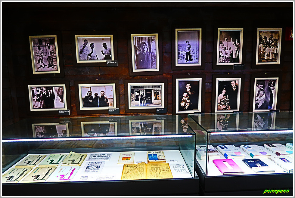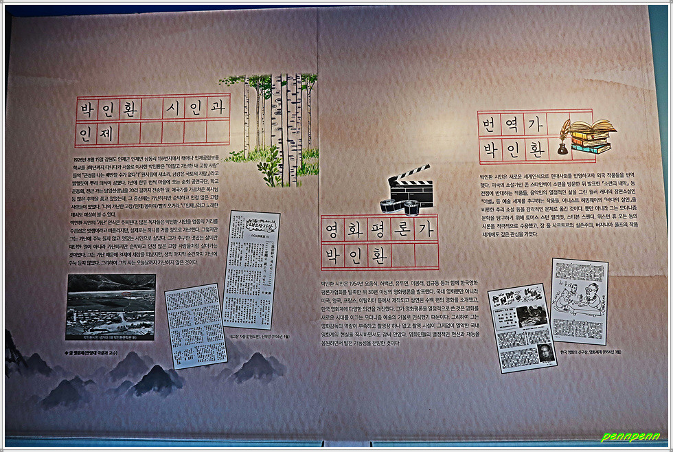인제산촌민속박물관 우측에 자리 잡은 박인환 문학관 정원에는 시인의 상반신 흉상과 앉은 자세의 부조가 세워져 있습니다. 문학관 안으로 들어서면 시인의 연보, 문학관 정원에 있는 조형물 사진 등을 전시해 놓고 있으며, 앉아있는 모습의 동상은 포토존입니다.