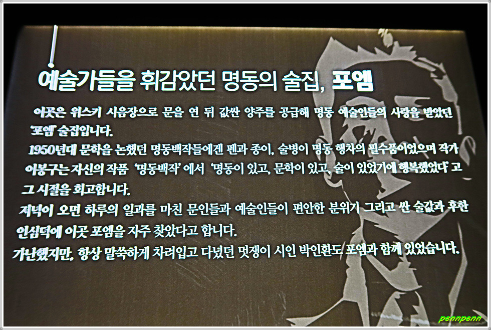 《포엠》은 예술가들을 휘감았던 명동 술집입니다. 포엠은 위스키 시음장으로 문을 연 뒤 값싼 양주를 공급해 명동 예술인들의 사랑을 받았던 곳입니다. 이곳에는 1950년대 문학을 논했던 예술인들이 자주 찾았으며, 가난했지만 항상 말쑥하데 차려입고 다녔던 멋쟁이 시인 박인환도 포엠과 함께 했습니다.
