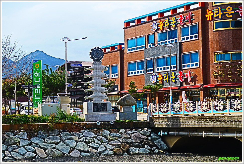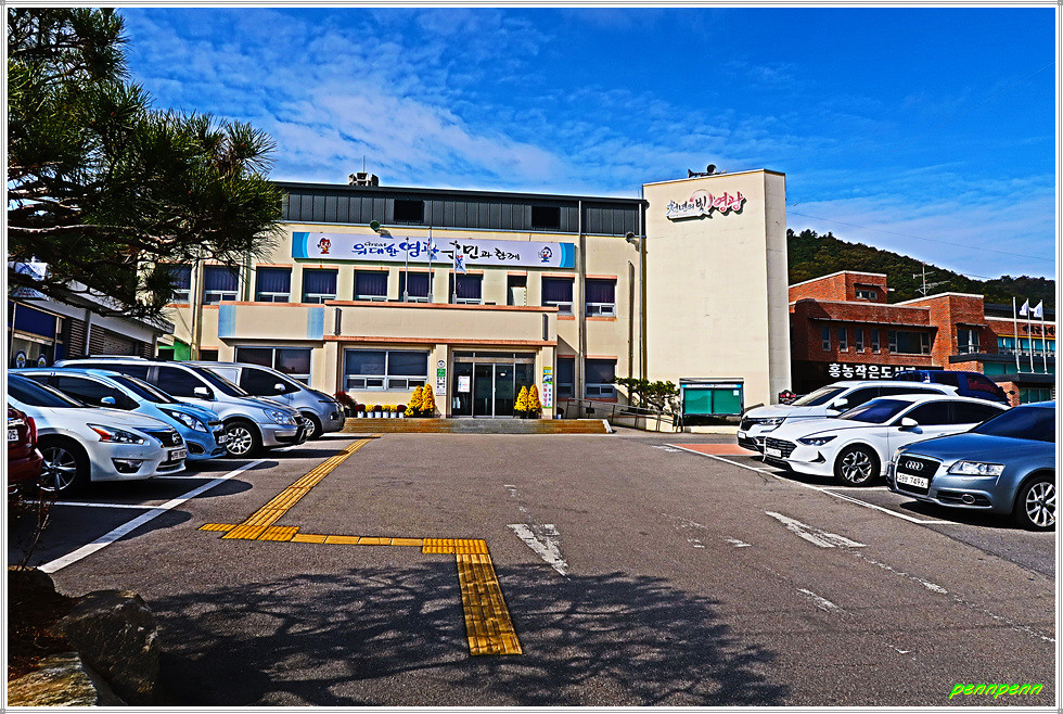 점점 고층건축물이 보이기 시작하면 홍농읍소재지에 온 것입니다. 언덕에 보이는 소나무 군락지가 참 멋지군요. 중앙동마을경노당과 홍능읍사무소, 굴비골 농협, 홍농유치원, 홍농중학교, 홍농119 안전센터, 현대오릴뱅크 주유소, 영광테마식물원과 영광승마장을 차례로 지나갑니다. 도로 우측에는 테마식물원 방문자센터가 보이는군요.