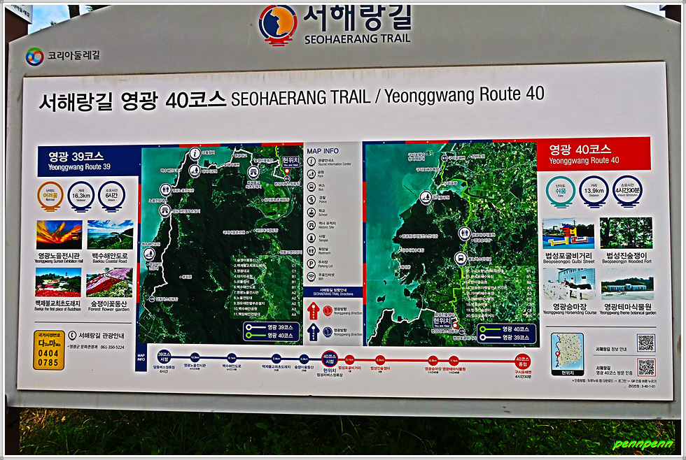 서해랑길 영광 40코스는 영광군 법성면 법성리 법성리버스정류장에서 출발해 전북 고창군 상하면 지룡리 구시포해변에 이르는 13.7km의 도보길로 전남 영광에서 전북 고창으로 이어지는 코스입니다. 이 코스에서는 200여 개에 달하는 상점과 식당이 영업 중인 영광굴비거리를 지나 전북 고창군 구시포해변에서 마무리하는 전라남도 마지막 코스입니다.