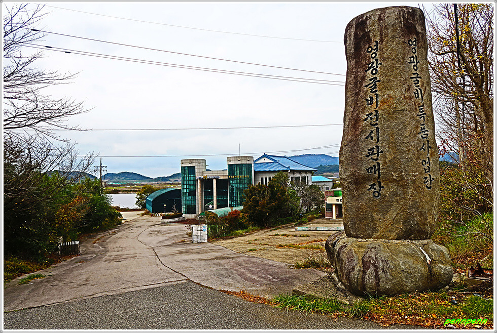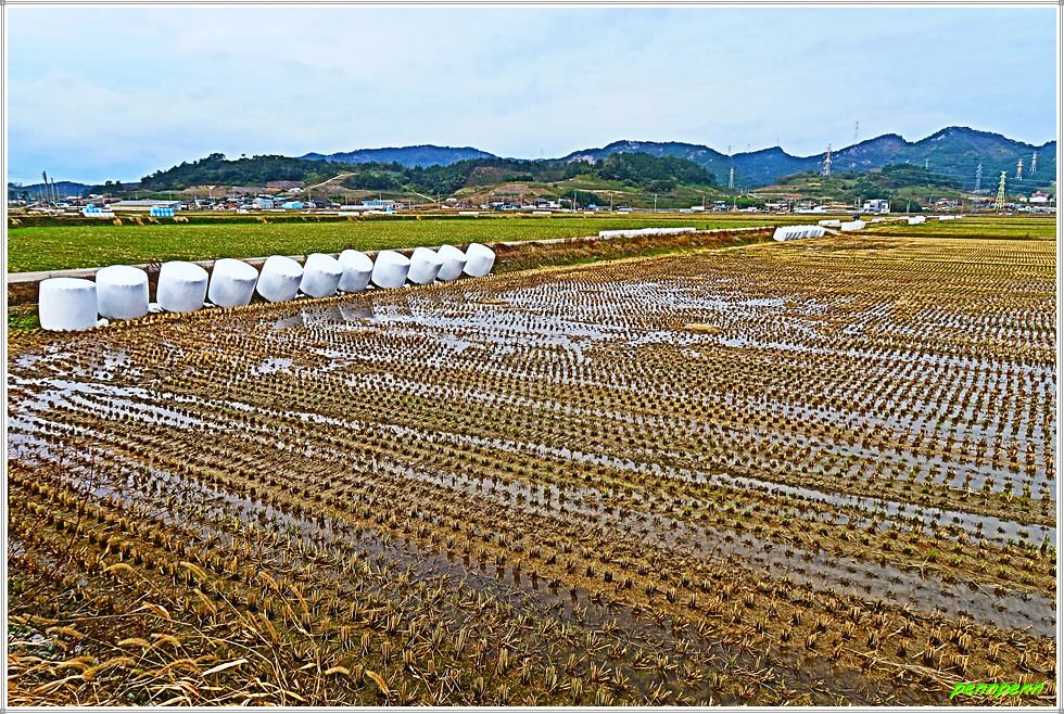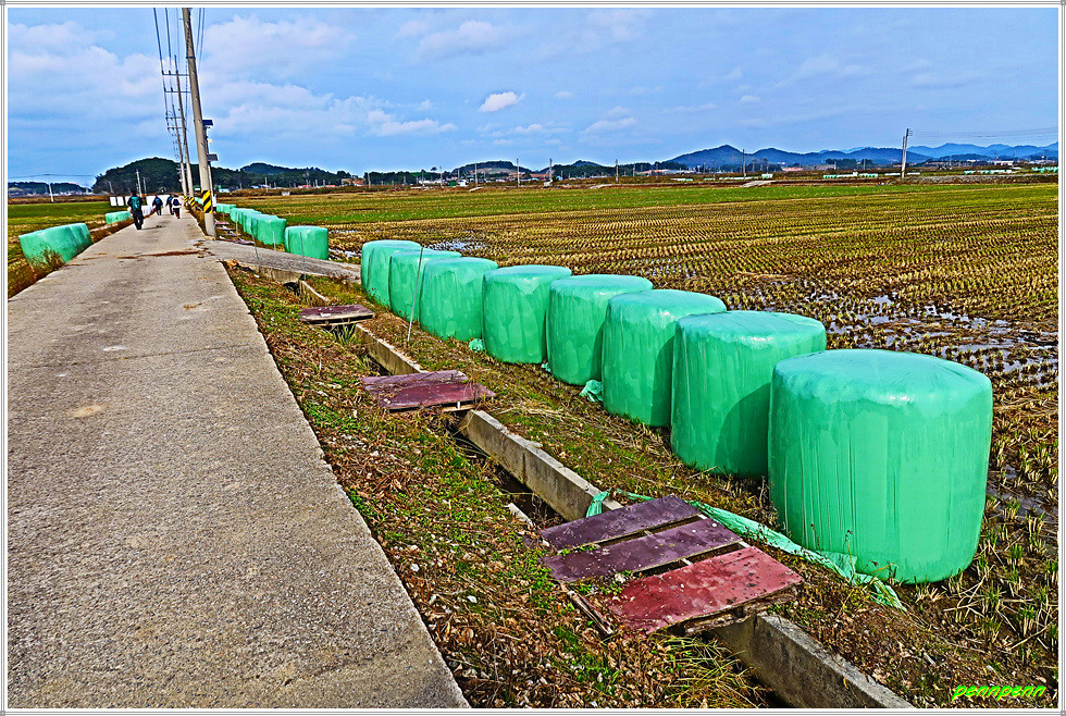 상삼제(저수지)를 지나면 진덕삼거리인데 직진하면 한빛원자력본부로 이어지지만 우리는 우측 고창 구시포 방면으로 몸을 돌려세웁니다. 이곳을 드론촬영금지구역으로 설정한 이유를 짐작하는 것은 어렵지 않지요. 진덕구 상삼마을 표석과 경노당을 지나갑니다. 차도를 건너 가는데 길섶에 놓아둔 곤포 사일리지(볏짚 동물사료 더미)의 색상이 연초록색입니다. 지금까지는 백색만 보았는데 다른 색상의 포장을 보니 새롭군요.