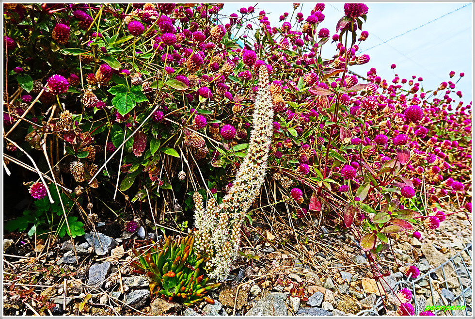 산과 들판에는 유난히 송전철탑이 많이 보이는 것은 아마도 인접한 영광한빛원자력발전소에서 생산한 전기를 송전하기 위한 시설일 테지요. 동네의 담장에는 천일홍이 피어 있는 가운데 좀처럼 보기 드문 꽃 하나가 눈길을 사로잡네요. 바로 와송인데 산지의 바위에서 주로 자라 바위솔이라고도 부르며, 기와 위에서 자라는 소나무 같다고 하여 “와송(瓦松)”이라는 이름이 붙었답니다.