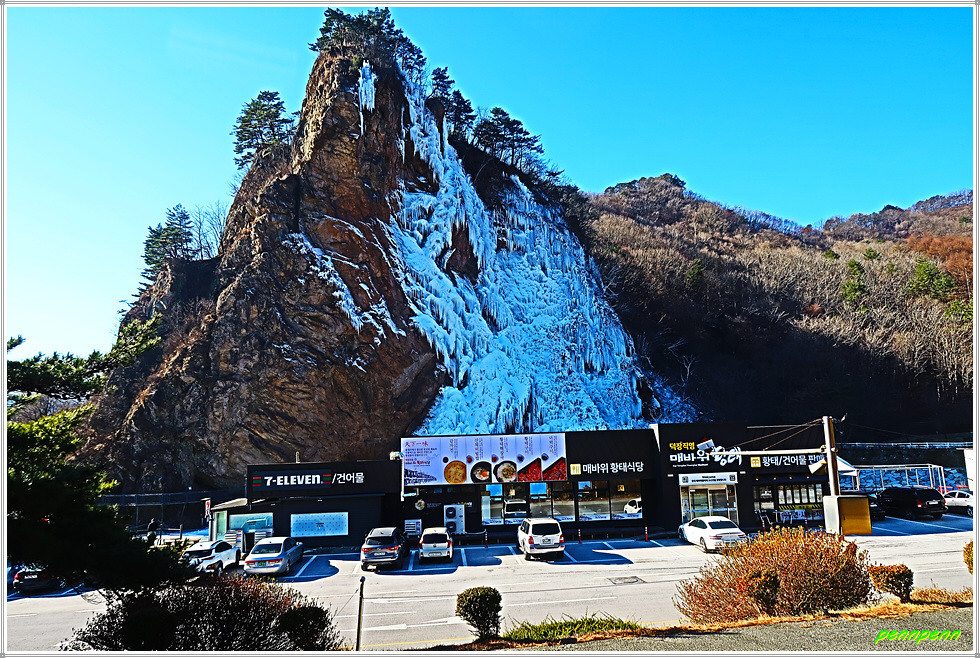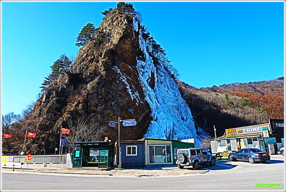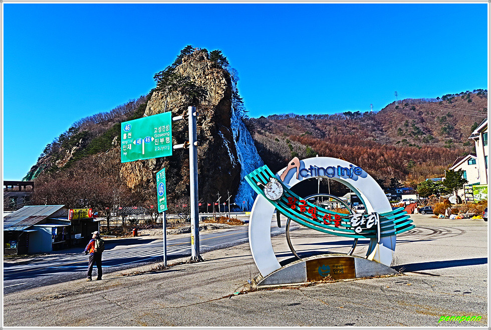 드디어 도로가 제법 복잡한 용대삼거리 인근입니다. 미시령계곡에서 흐르는 소하천이 북천과 합류하는 지점의 옥수1교를 건너 좌측으로 들어서면 넓은 광장이 나오는데 바로 용대삼거리로 매바위 인공폭포를 볼 수 있는 곳입니다. 인제군 북면 용대리 소재 매바위 인공폭포는 봄과 여름 및 가을까지는 시원한 폭포수가 흐르는 광경을 볼 수 있으며, 겨울에는 빙벽등반이 가능하도록 얼음기둥을 만드는 곳입니다. 인제군 지질명소로 꼽히는 이곳은 82m 높이에서 물줄기가 강하게 쏟아져 내려 장관을 연출해 근처에만 가도 시원함이 느껴지는 명소입니다.