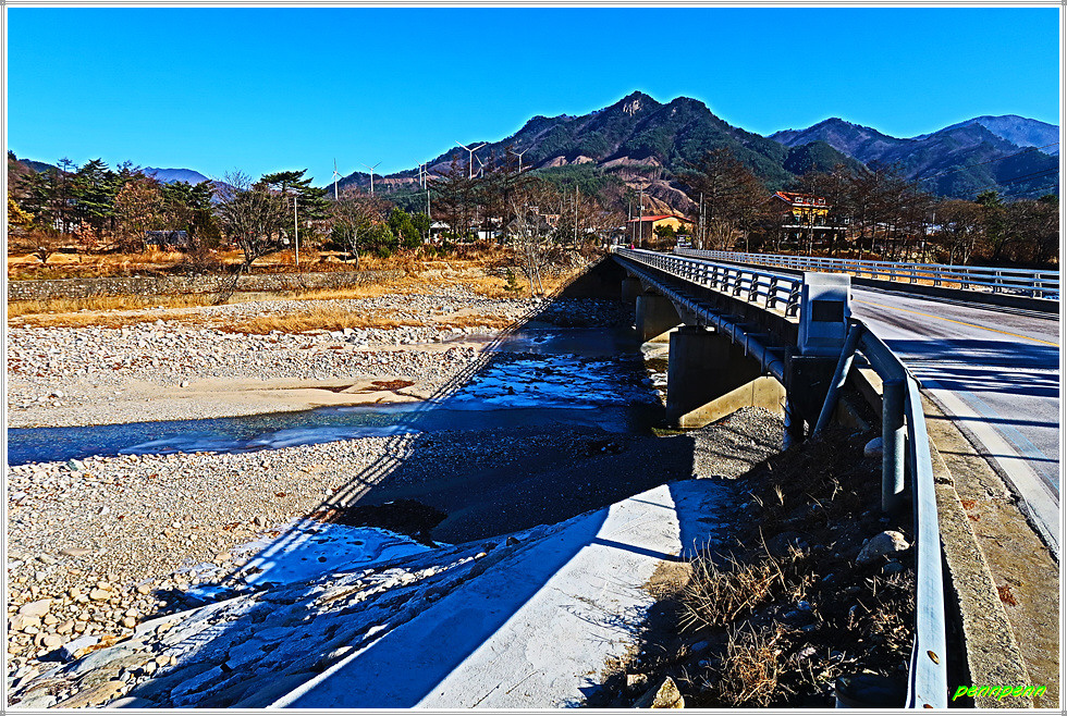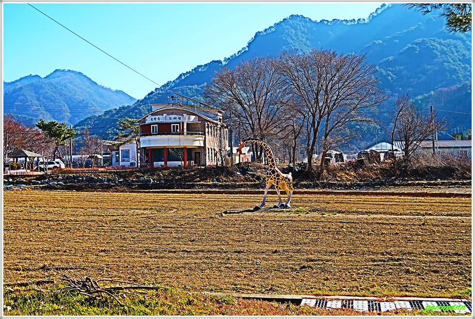 여초서예관을 관람한 후 북천의 구만동계곡을 가로지르는 구만교 옆을 지나갑니다. 도로변에 반듯하게 보이는 가옥은 대부분 펜션과 카페로군요. 길섶의 안내문을 보니 이곳의 행정구역은 인제군 용대리 구만동입니다. 영실천이 북천에 합류하는 지점의 내가평교를 건너갑니다. 북쪽으로 여러 기의 풍력발전기가 보이는 가운데 응달의 북천은 꽁꽁 얼어붙은 모습입니다. 밭에는 기린의 조형물이 쓸쓸하게 서 있군요.