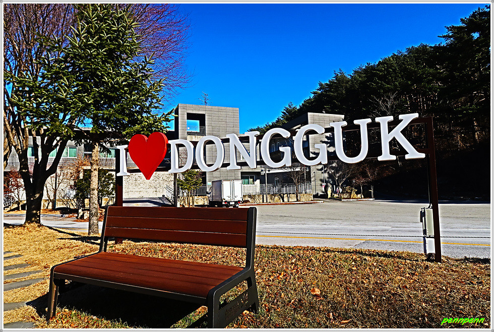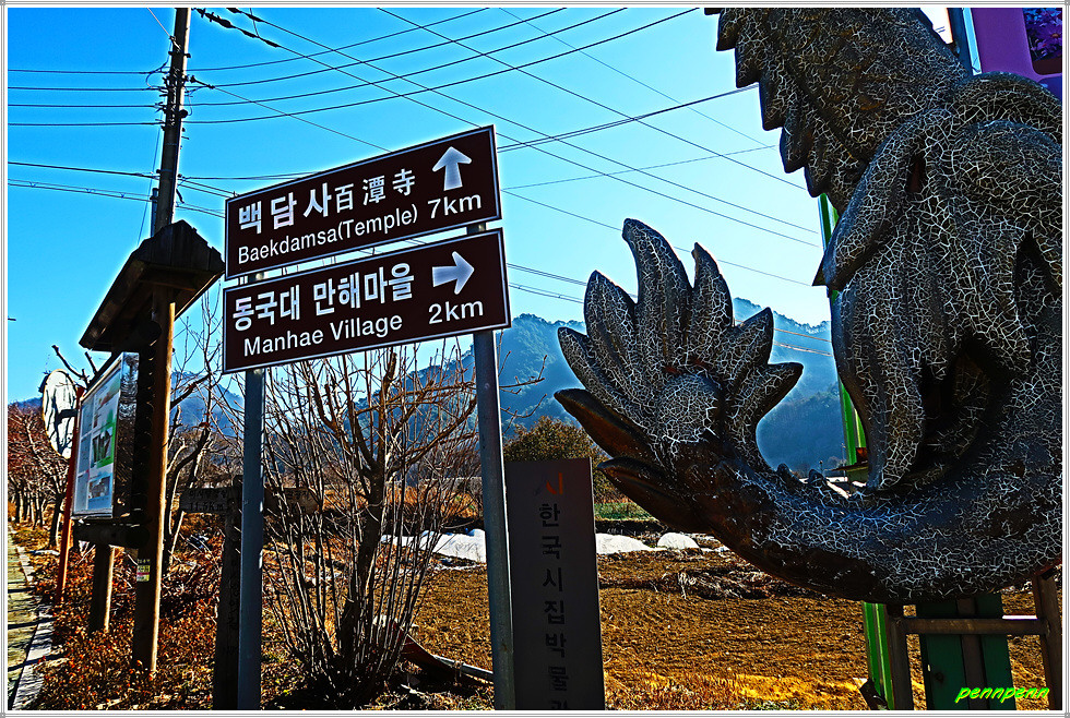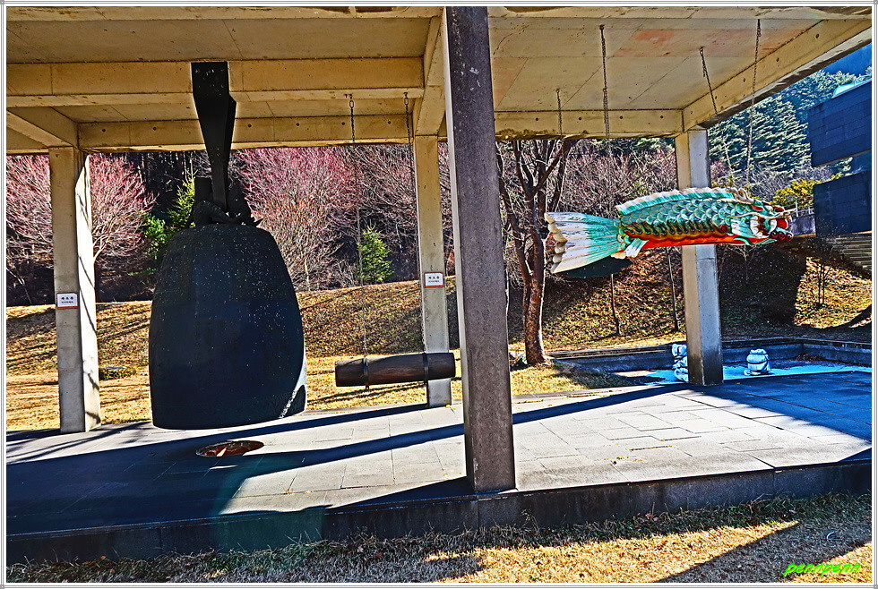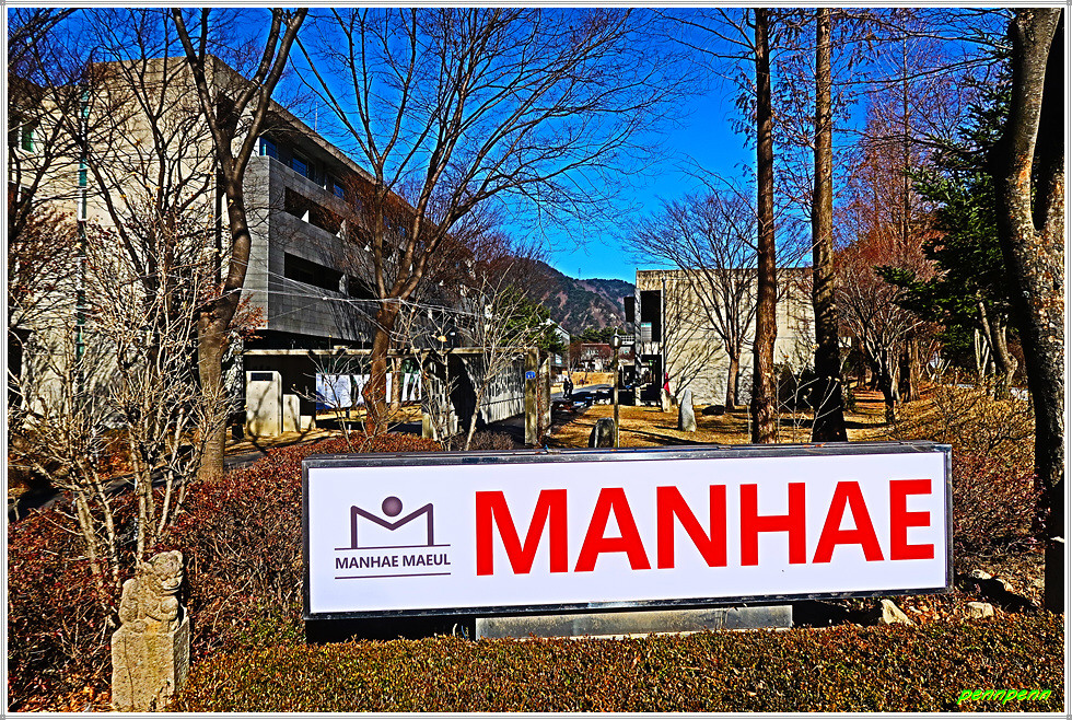 만해교를 건너면 만해마을을 알리는 적색 영문글자가 이방인을 맞이합니다. 인제군 북면 용대리 소재 동국대 만해마을은 한국문학의 우뚝 선 시인 겸 독립운동가인 만해 한용운 대선사의 치열한 오도(悟道)의 수행공간이자 시집 “님의 침묵”을 집필한 백담사를 배경으로 2003년에 조성된 휴식처입니다. 그런데 일반적으로 전주한옥마을이나 서울 남산골한옥마을처럼 “마을”이 들어간 곳은 한옥(초가 및 기와집)이 있기 마련인데 이곳은 “한옥마을”이 아니라 그냥 마을이어서 그런지 한옥은 한 채도 보이지 않고 현대식 건축물만 보일 뿐입니다. 만해를 알리는 적색영문글씨, 불교를 상징하는 범종과 목어, 그리고 동국대 입체글씨가 없었더라면 만해마을인지도 모르고 지나칠 뻔 했습니다.