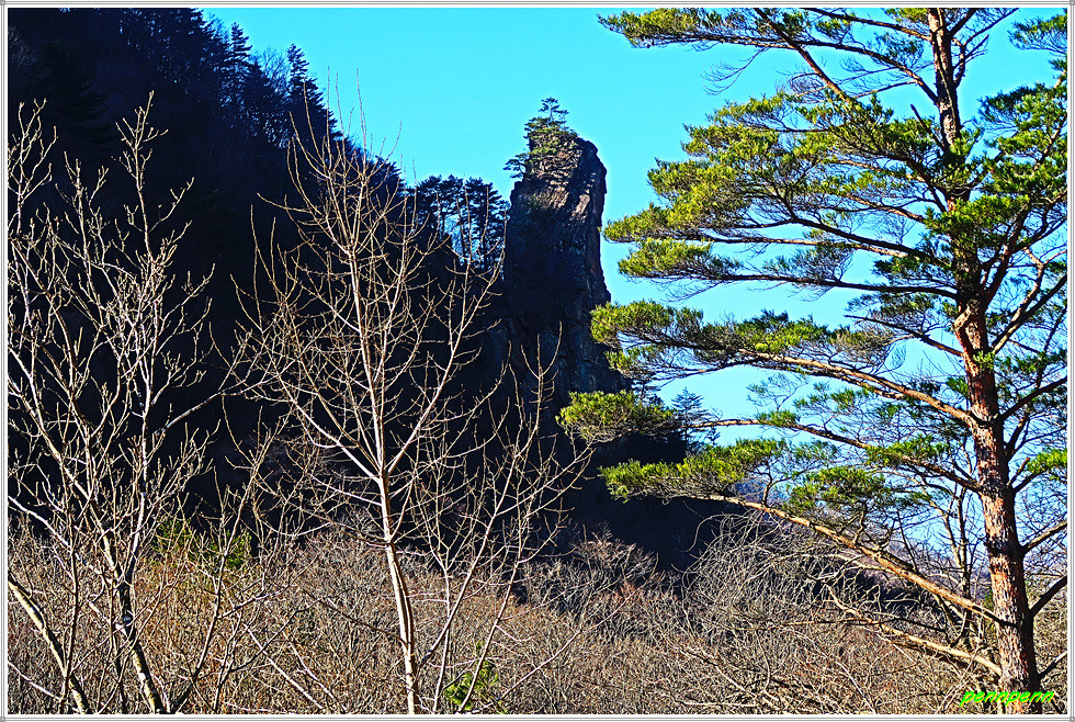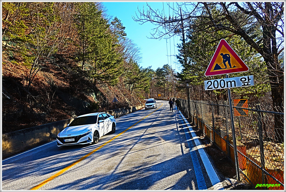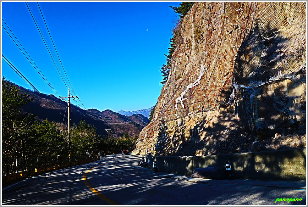 고도를 높이면서 뒤돌아보니 멀리 높은 고산에는 눈이 쌓여 있네요. 해발고도가 높은 곳에는 눈이 내린 것 같습니다. 아마도 저 고산은 인제 매봉산(1,271m)일 것입니다. 매봉산 주변에는 대암안(1,313m)과 도솔산(1,148m) 등이 있거든요. 여기서 조금 더 가면 바로 미시령 정상입니다.